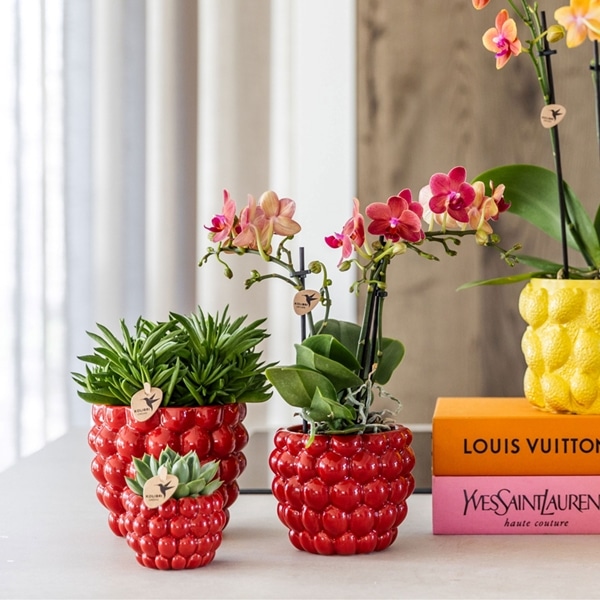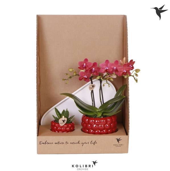 Raudonos orchidėjos ir sukulento kompozicija.