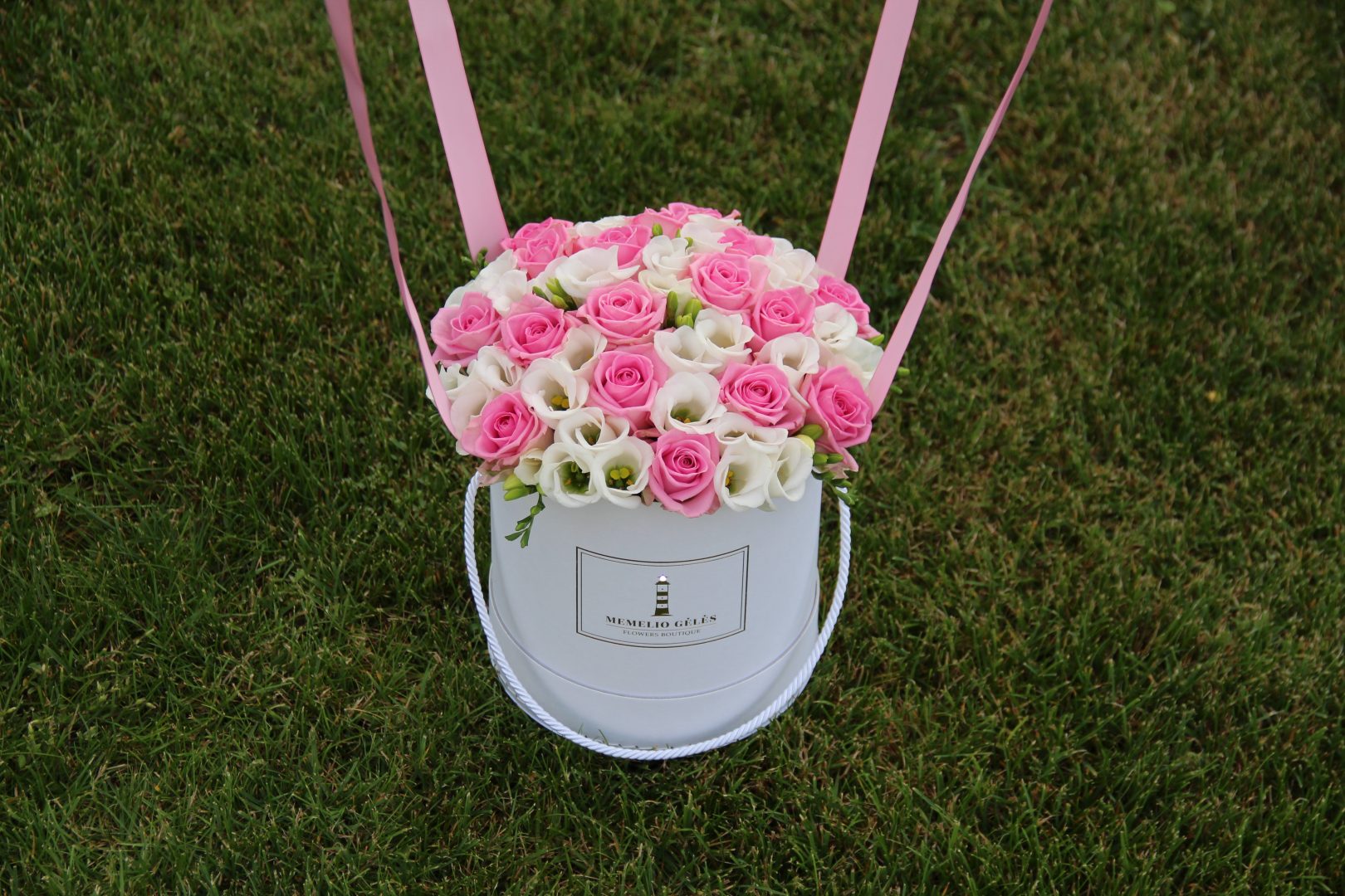 Nuotraukoje pavaizduota didelė 18x19cm gėlių dėžutė bei 50cm skersmens helinis balionas. Yra galimybė užsakyti papildomą užrašą.