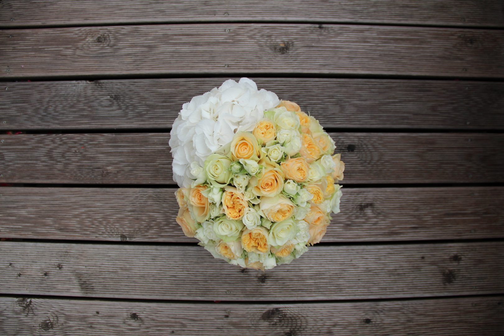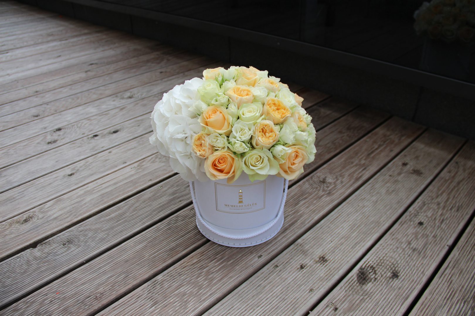 Pastelinė kompozicija su balta hortenzija, persikinėmis ir baltomis rožėmis.