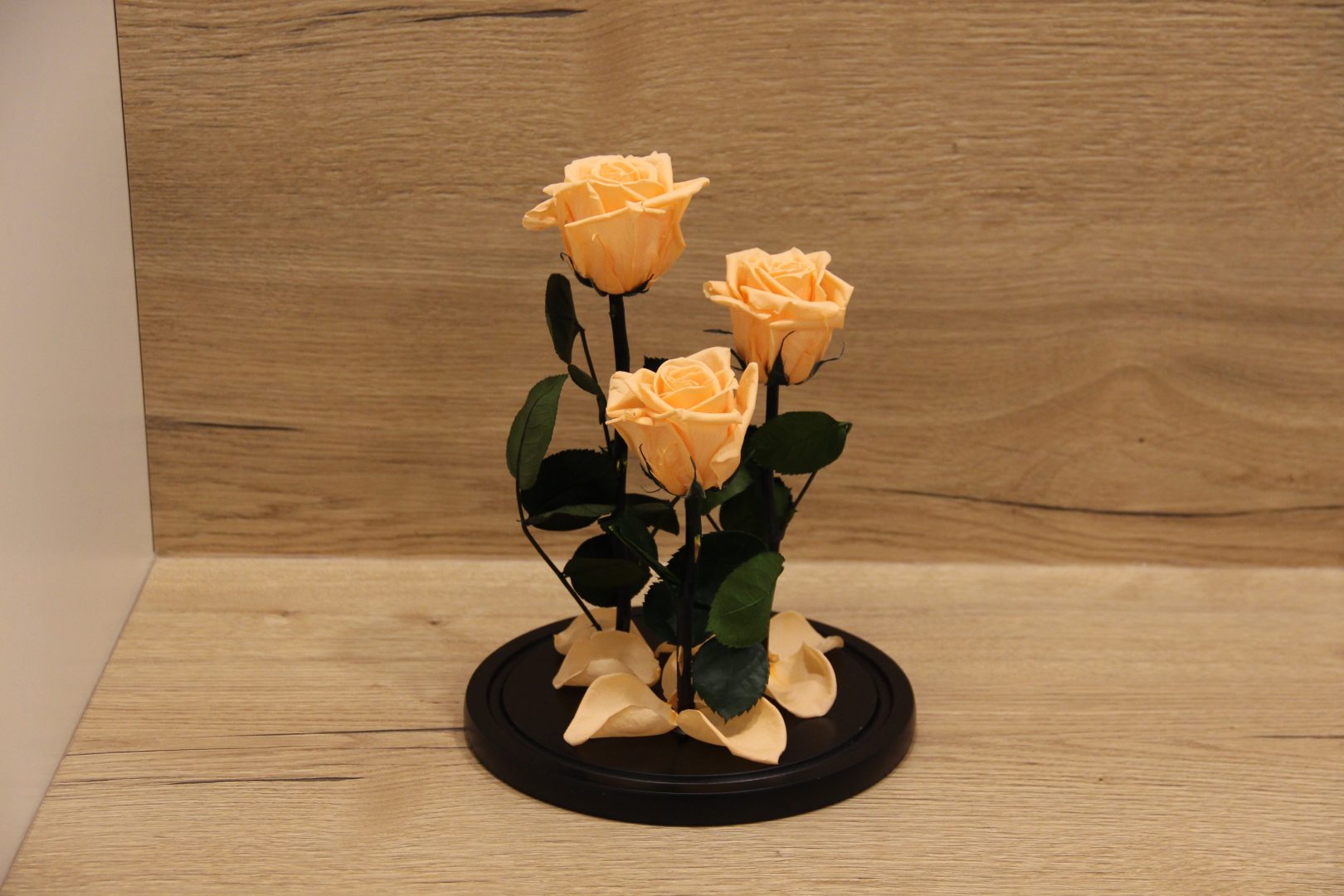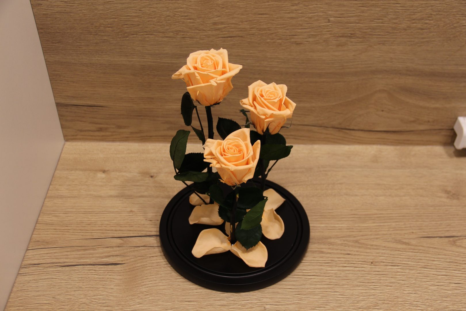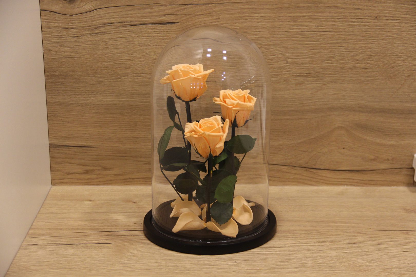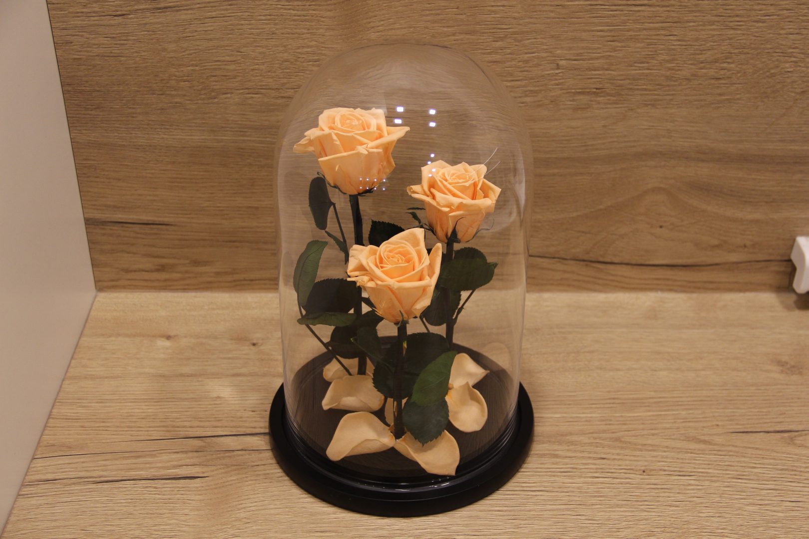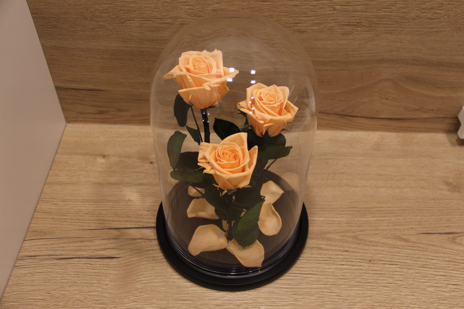 Persikinės miegančios rožės po kupolu iš filmo Gražuolė ir pabaisa.