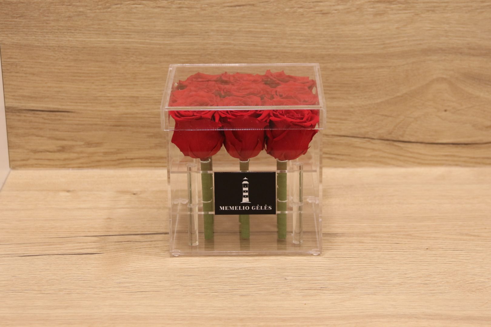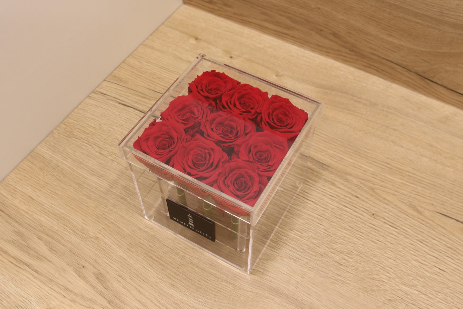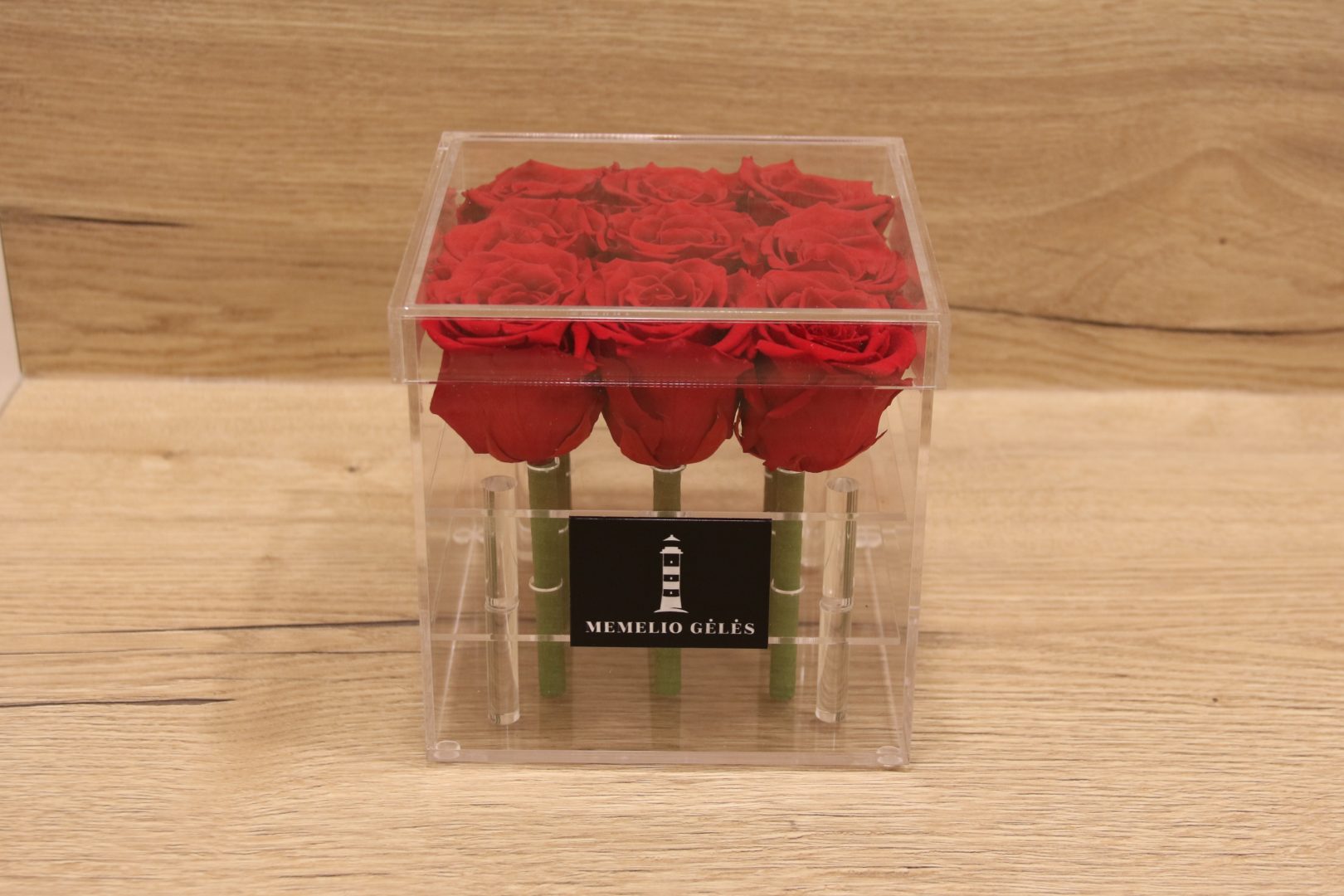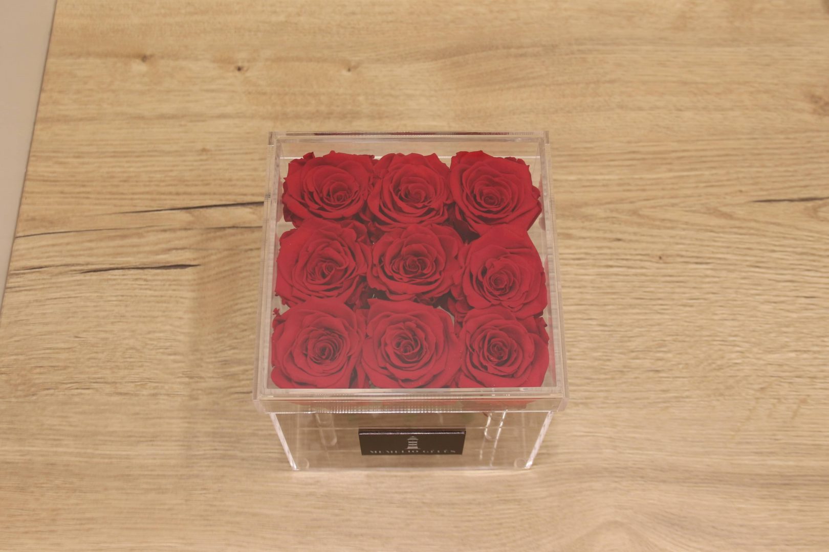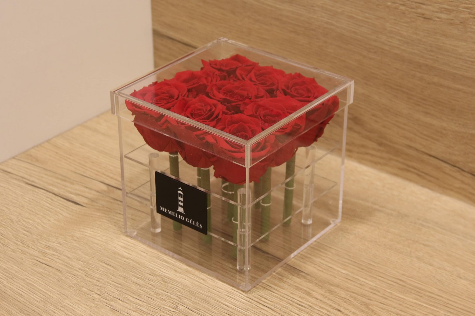 Akrilinė dėžutė su 9 raudonomis miegančiomis rožėmis, kurios Jus džiugins iki kelerių metų.