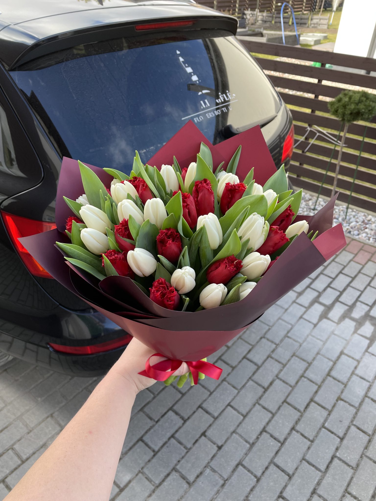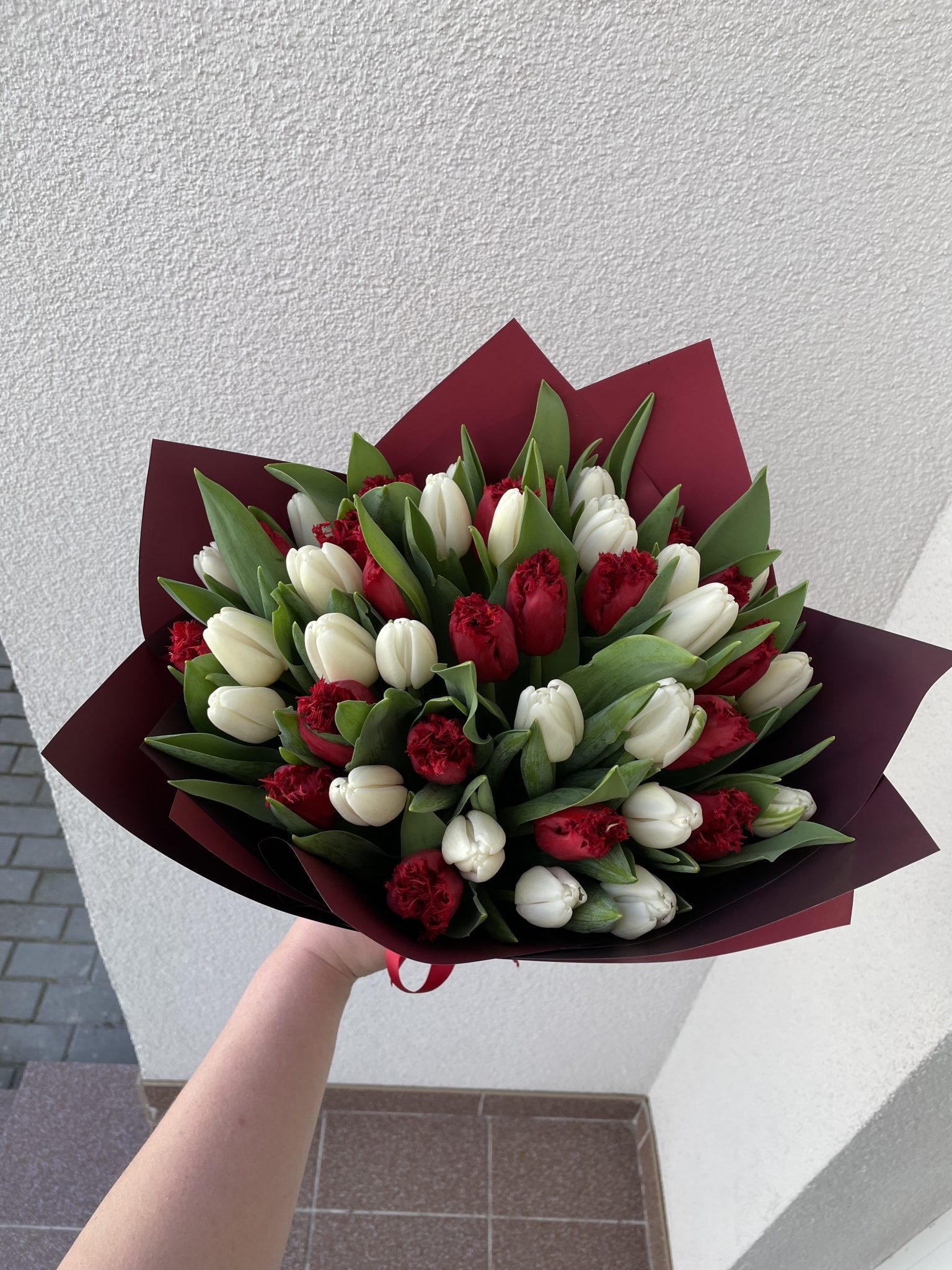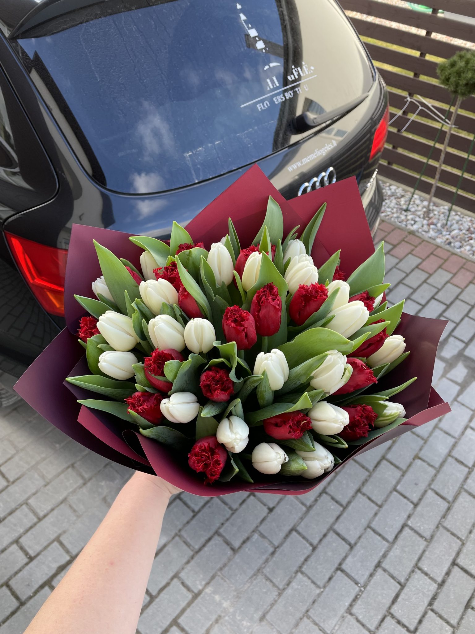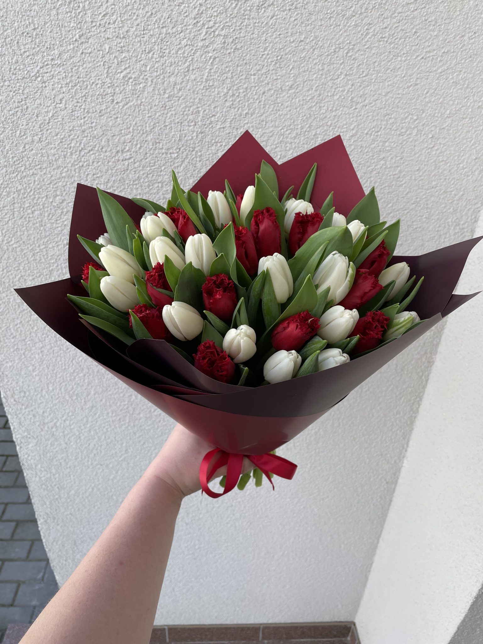 49 raudonų su kirpčiukais ir baltų tulpių puokštė.