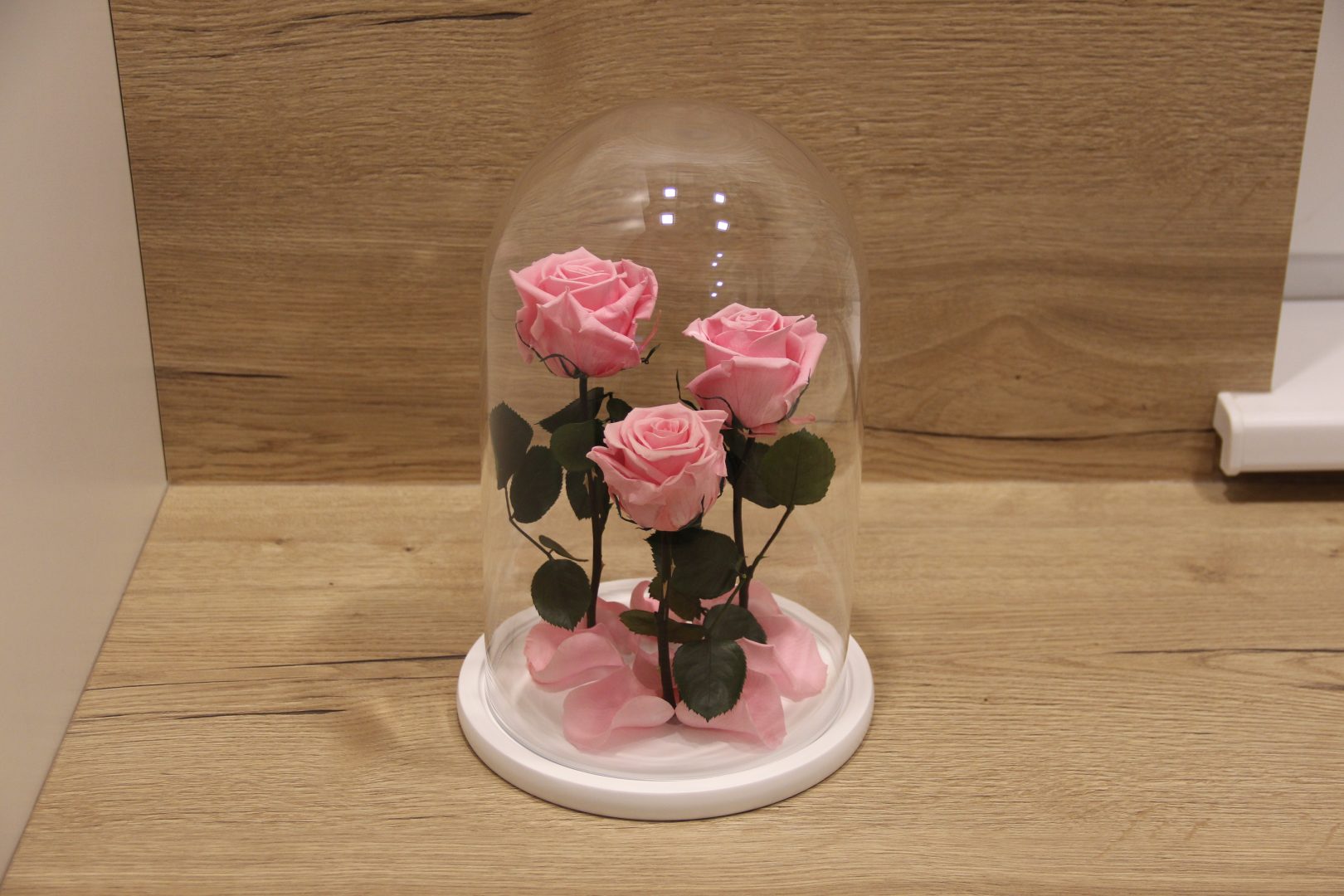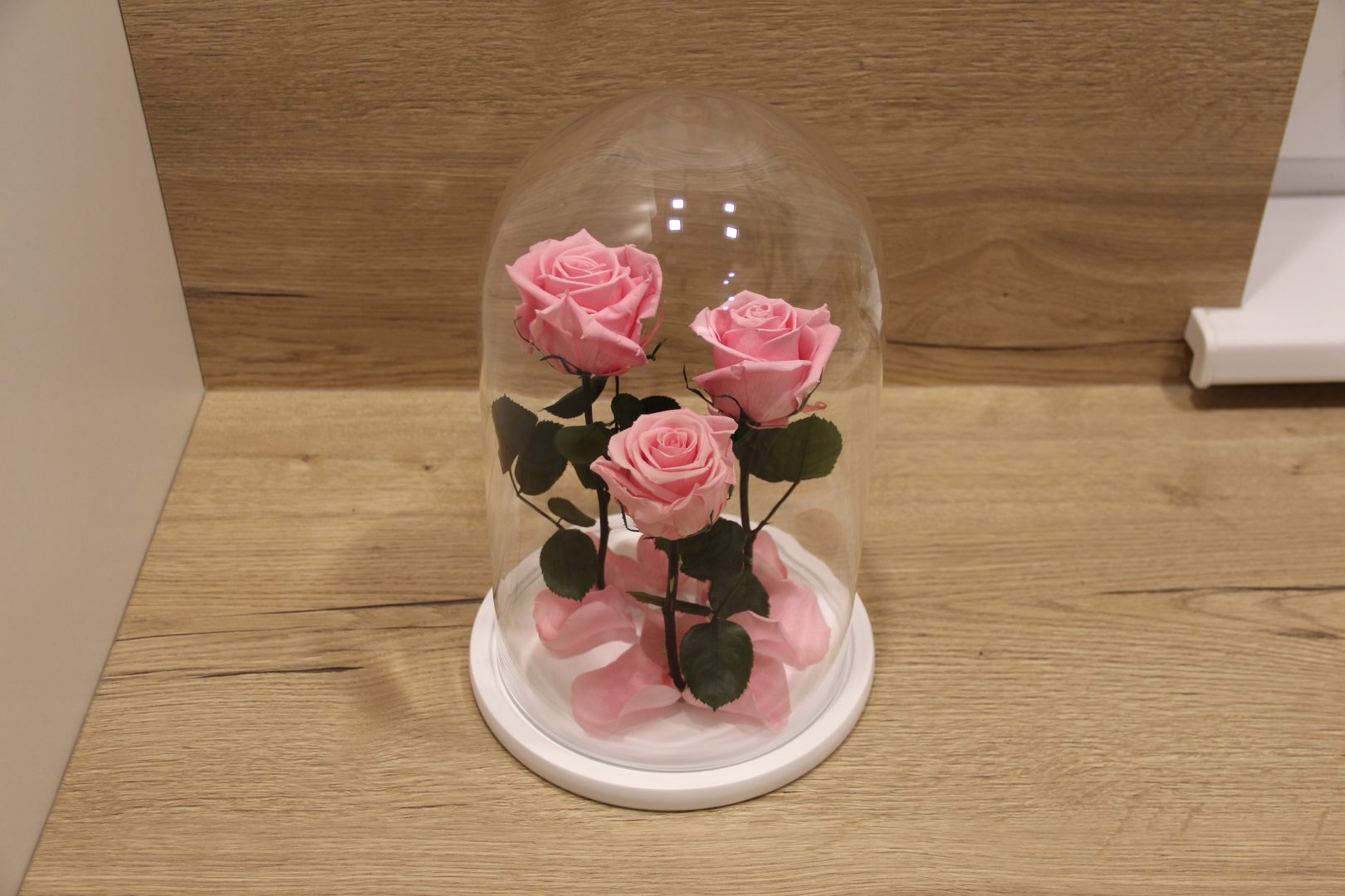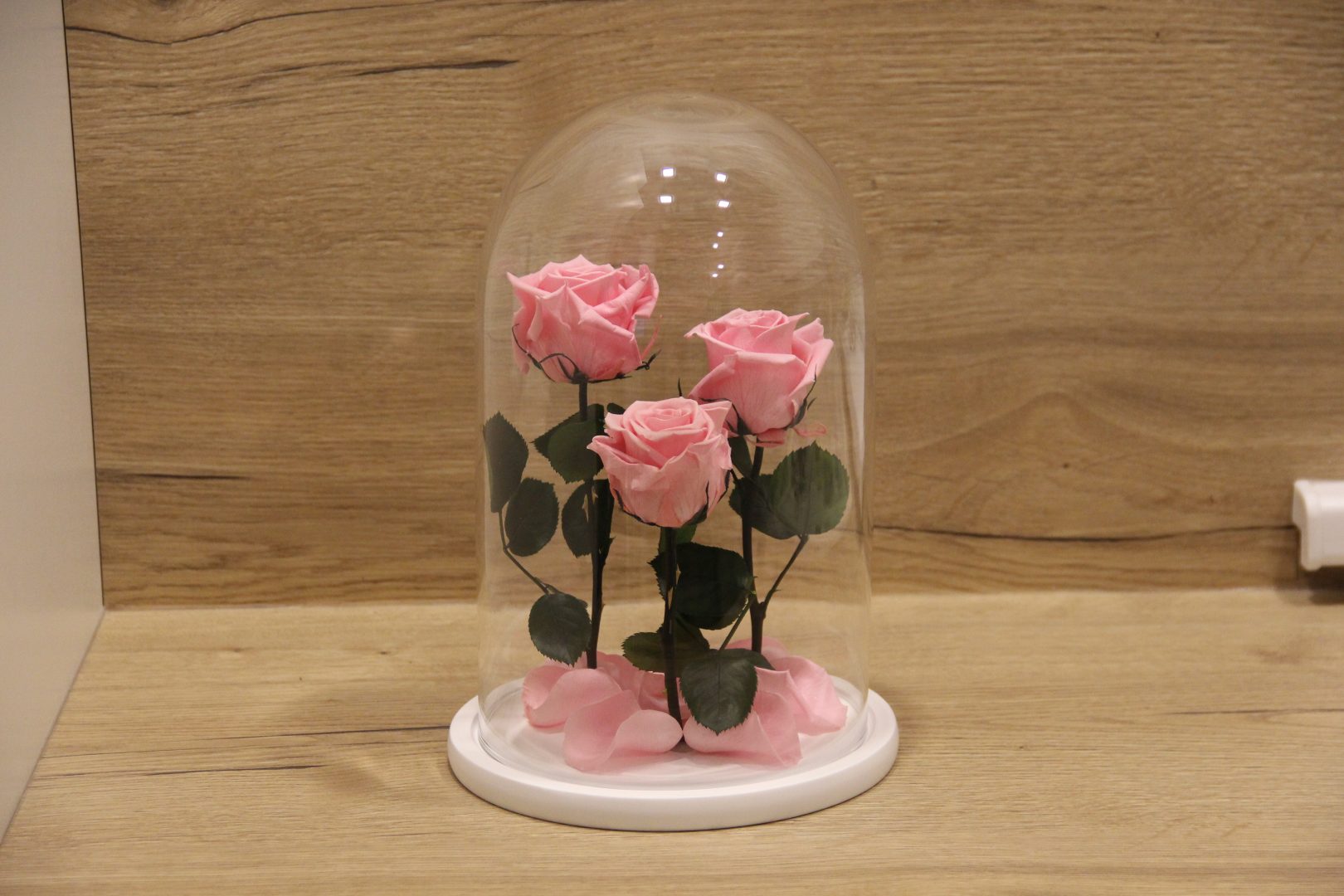 Šviesiai rausvos miegančios rožės po kupolu iš filmo Gražuolė ir pabaisa.