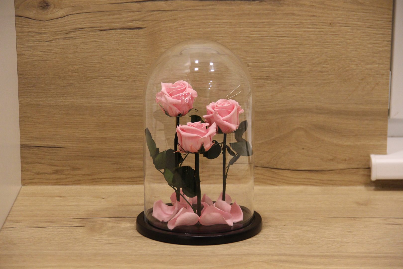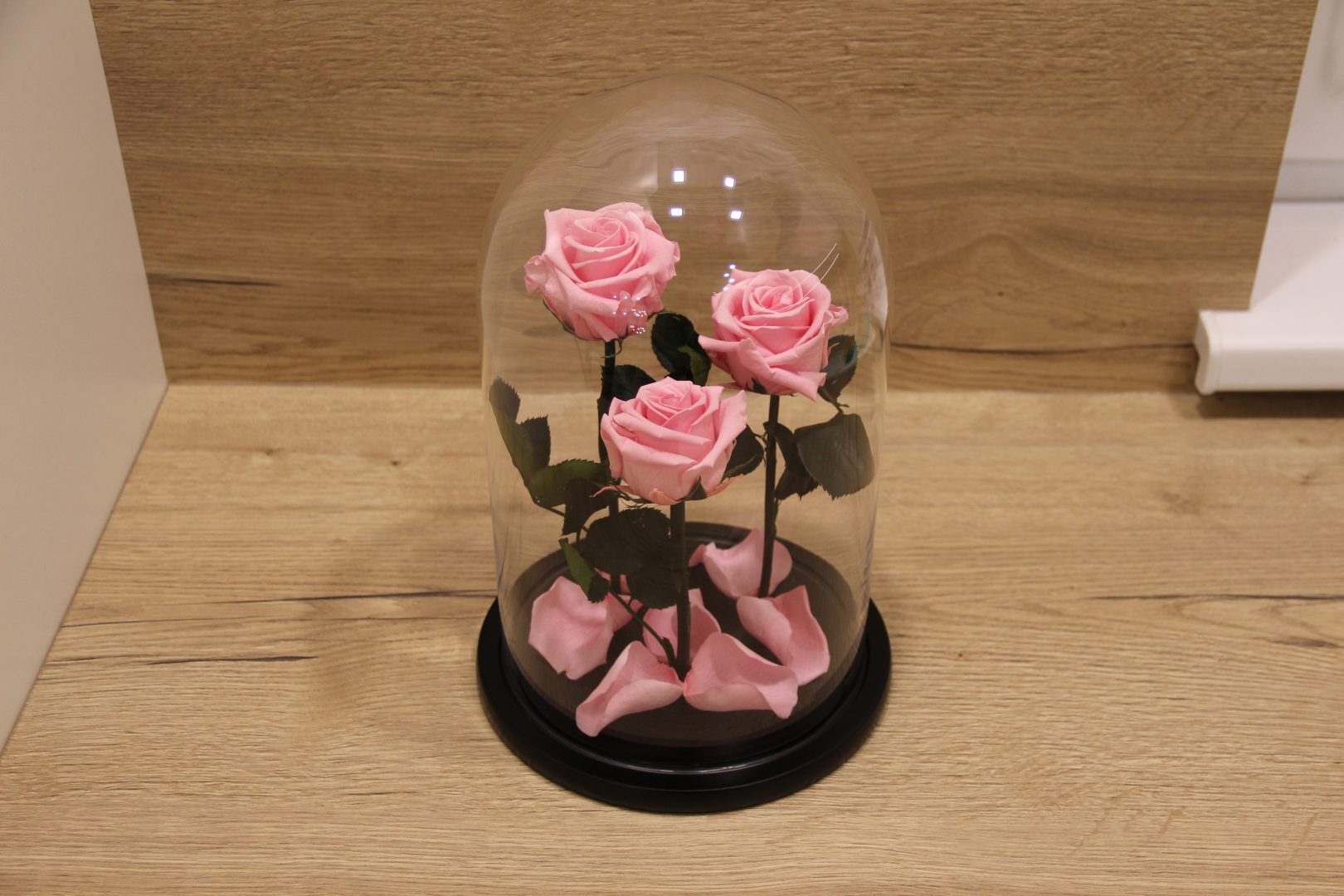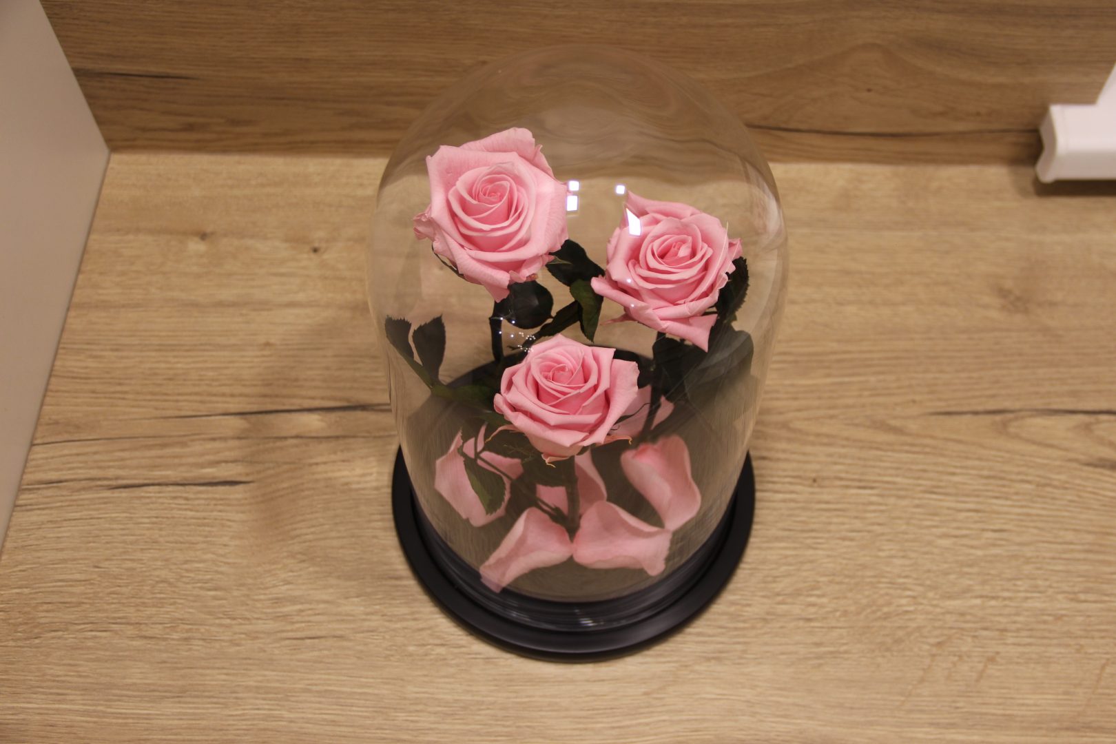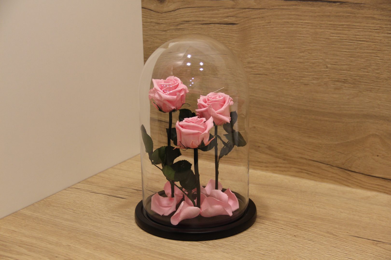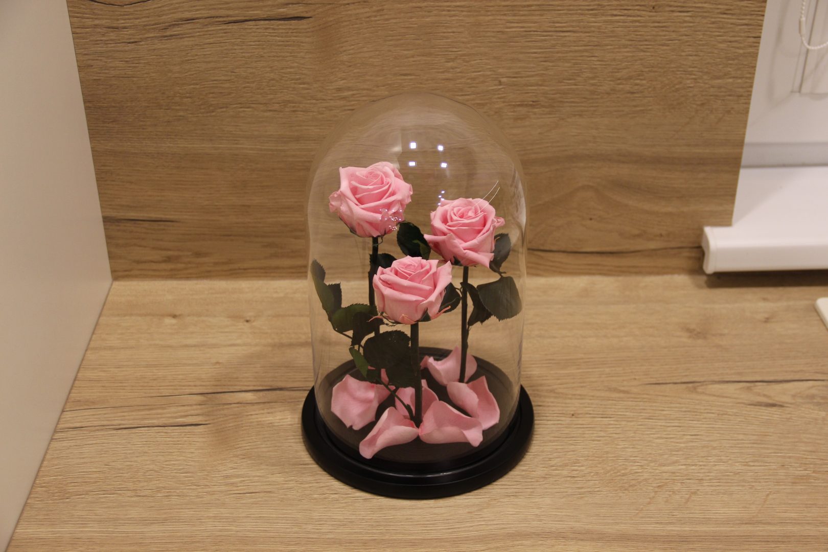Šviesiai rausvos miegančios rožės po kupolu iš filmo Gražuolė ir pabaisa.