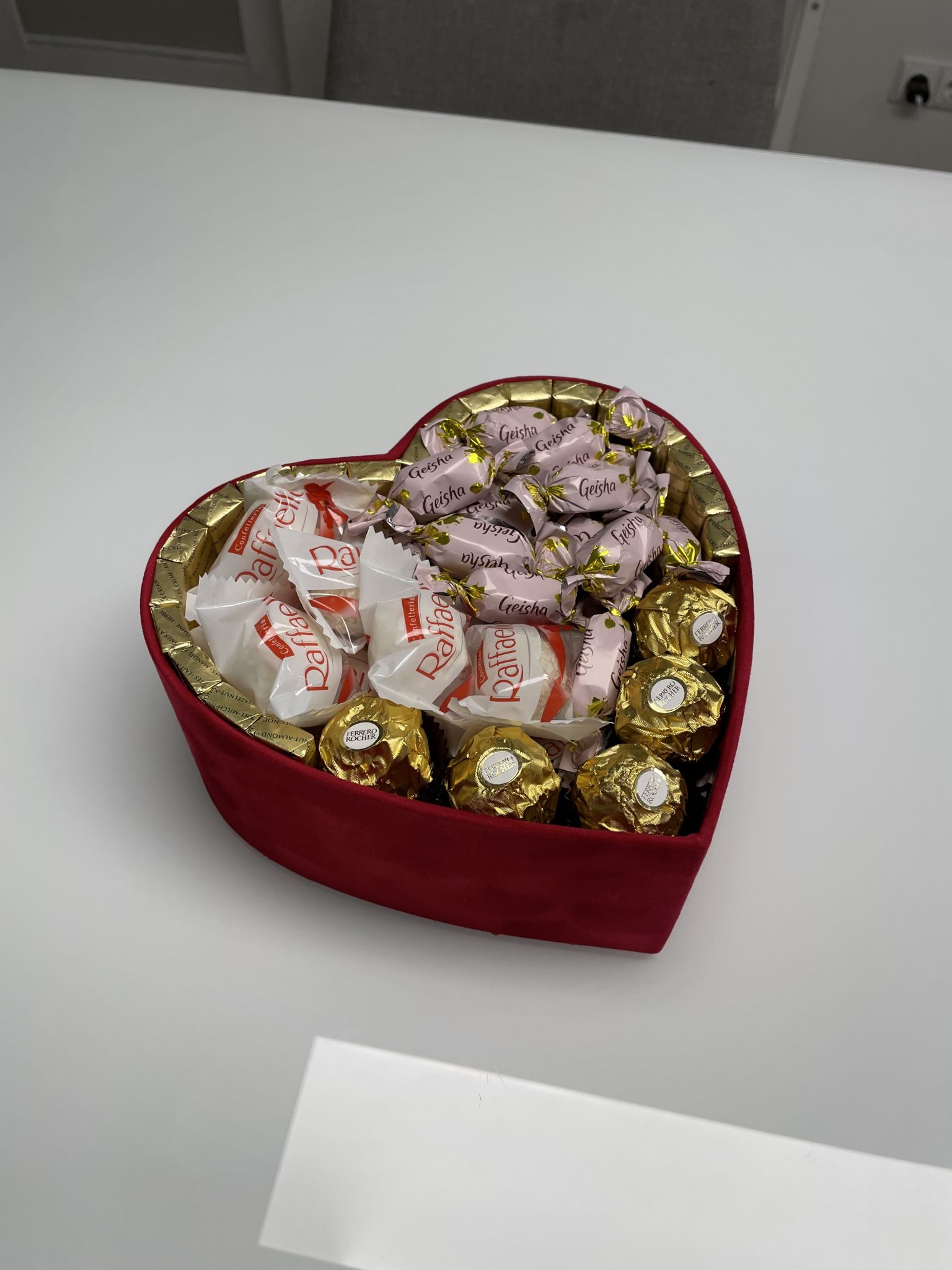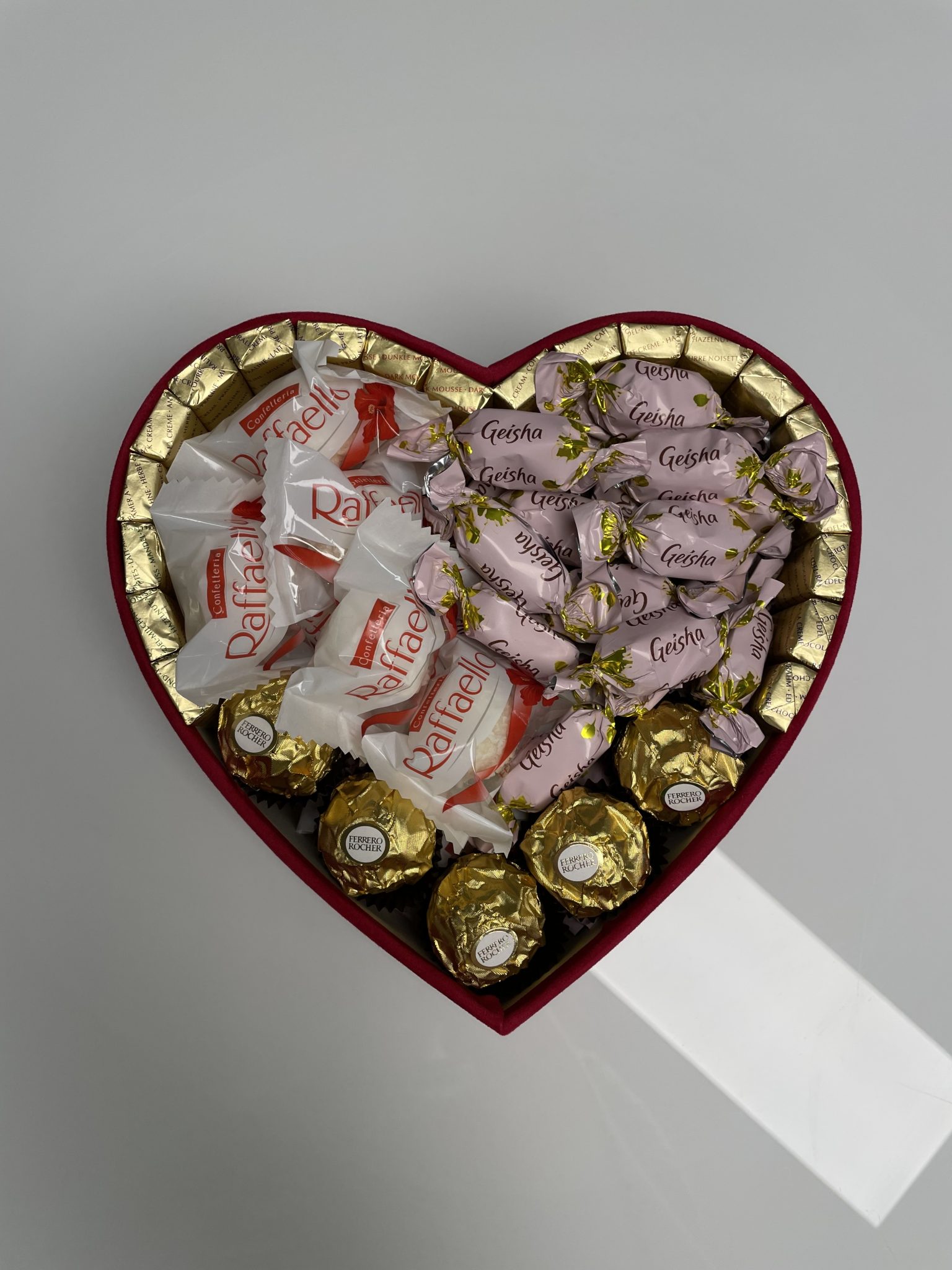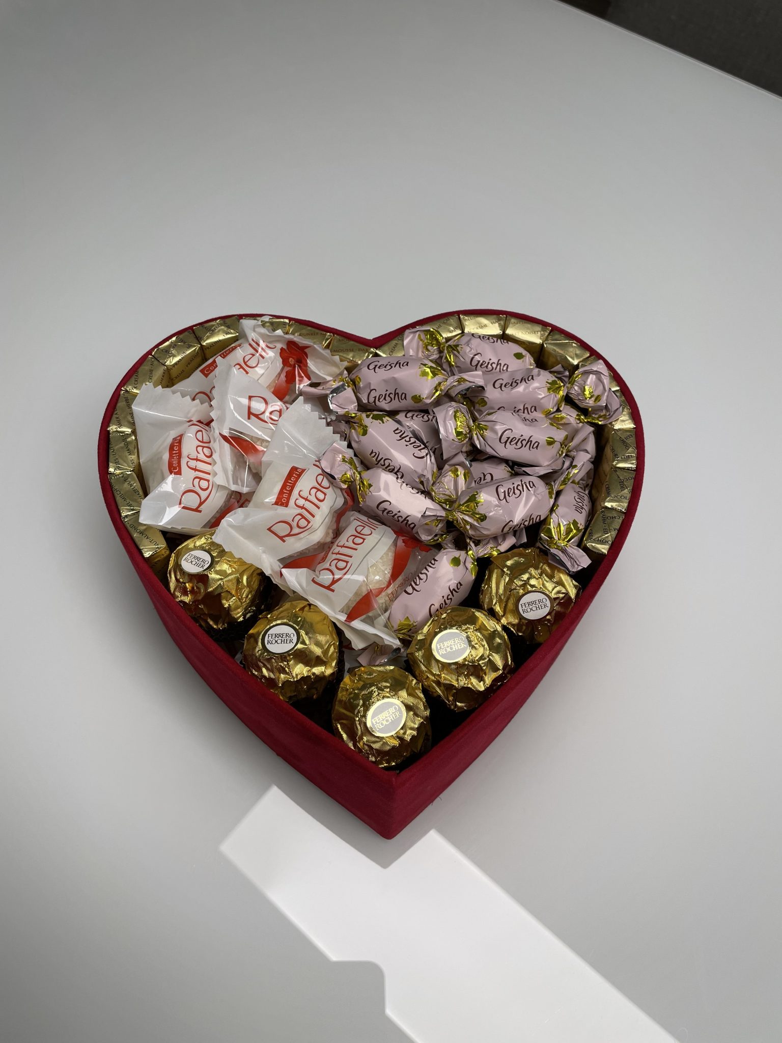Sudėtis: Raffaelo saldainiai (300g), Geisha (350g), Merci (250g), Ferrero Rocher (80g). Pilna saldainių dežutė iki pat dugno!