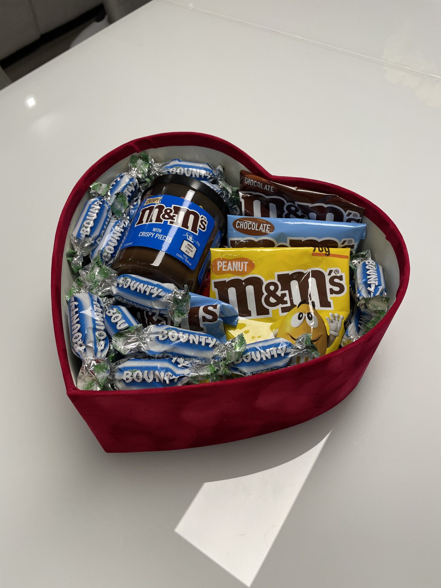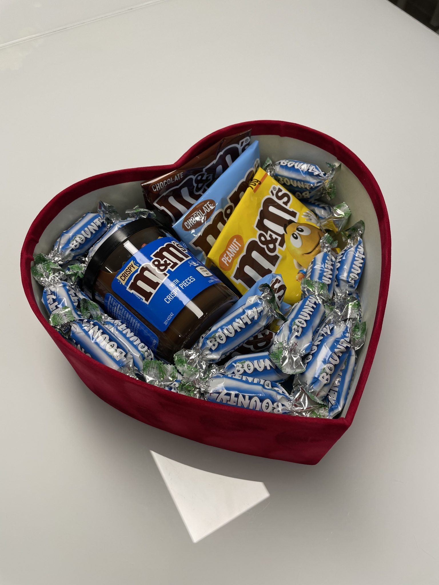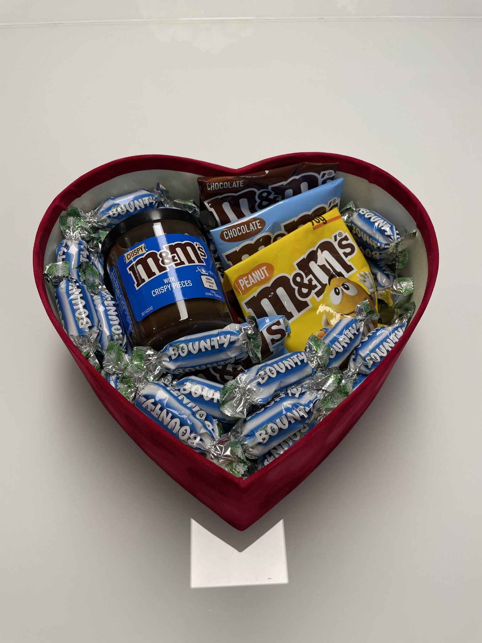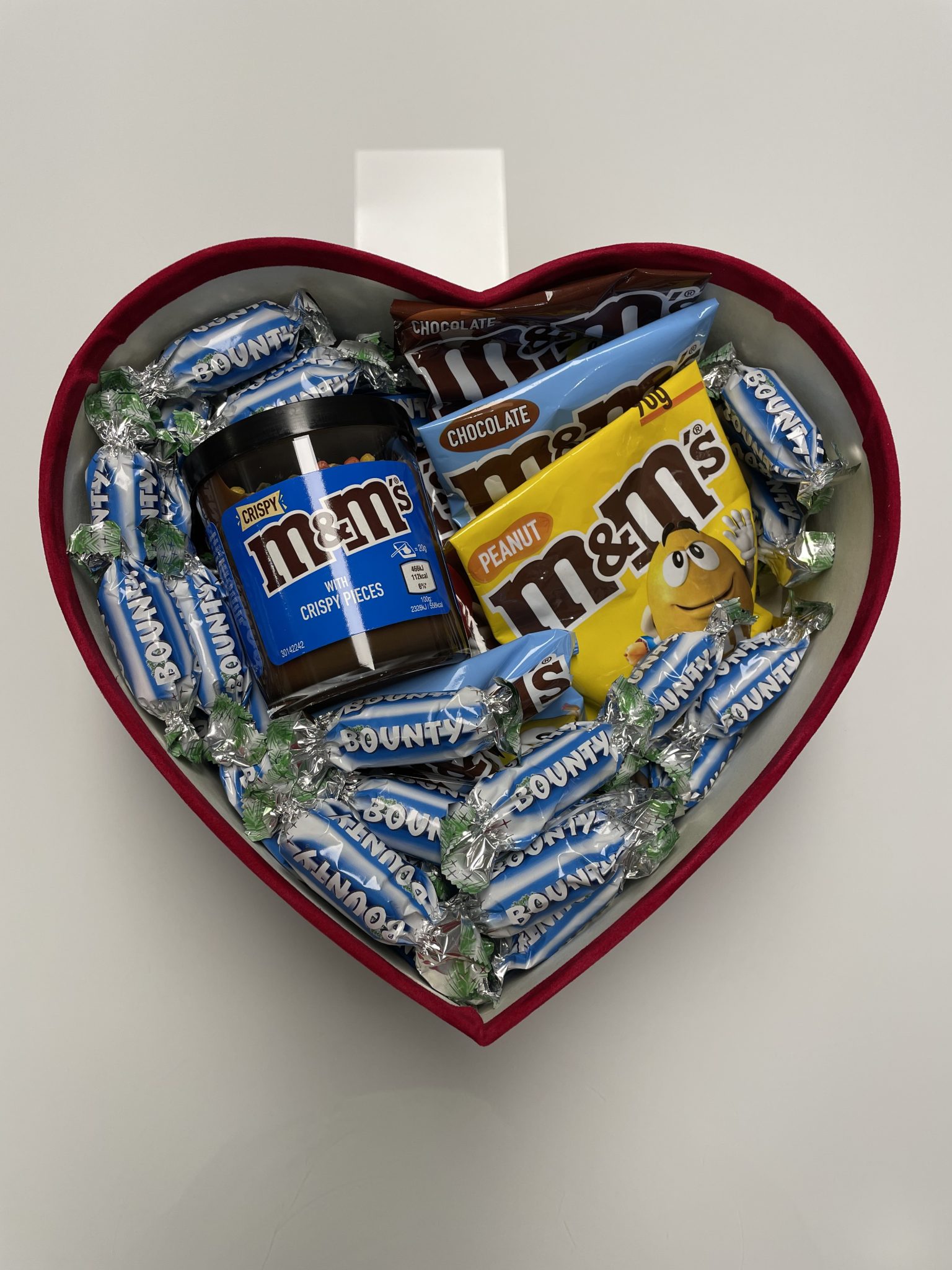 Sudėtis: tepamas kremas M&M’s (200g), šokoladiniai saldainiai M&M’s Choco (2x90g), šokoladiniai saldainiai M&M’s Peanut (2x90g), šokoladiniai saldainiai M&M’s margi kiaušiniai (2x90g), saldainiai Bounty (400g).