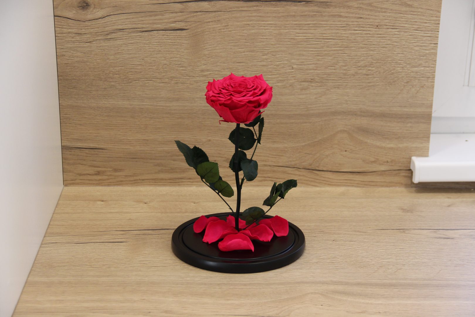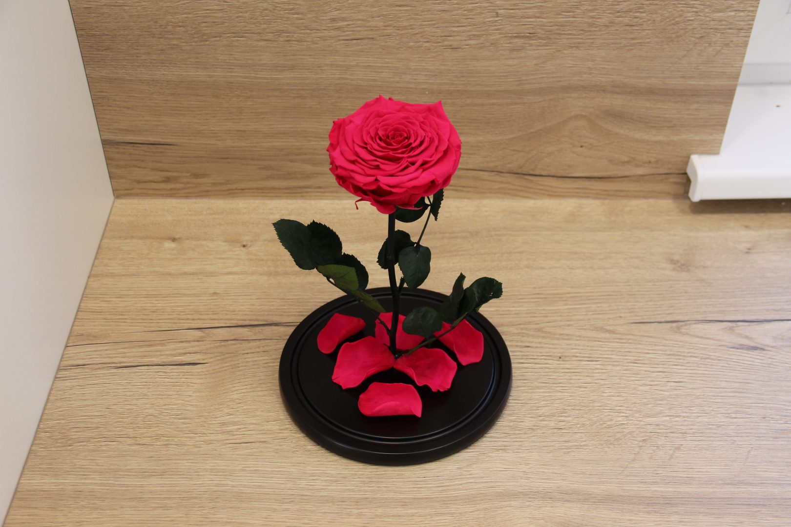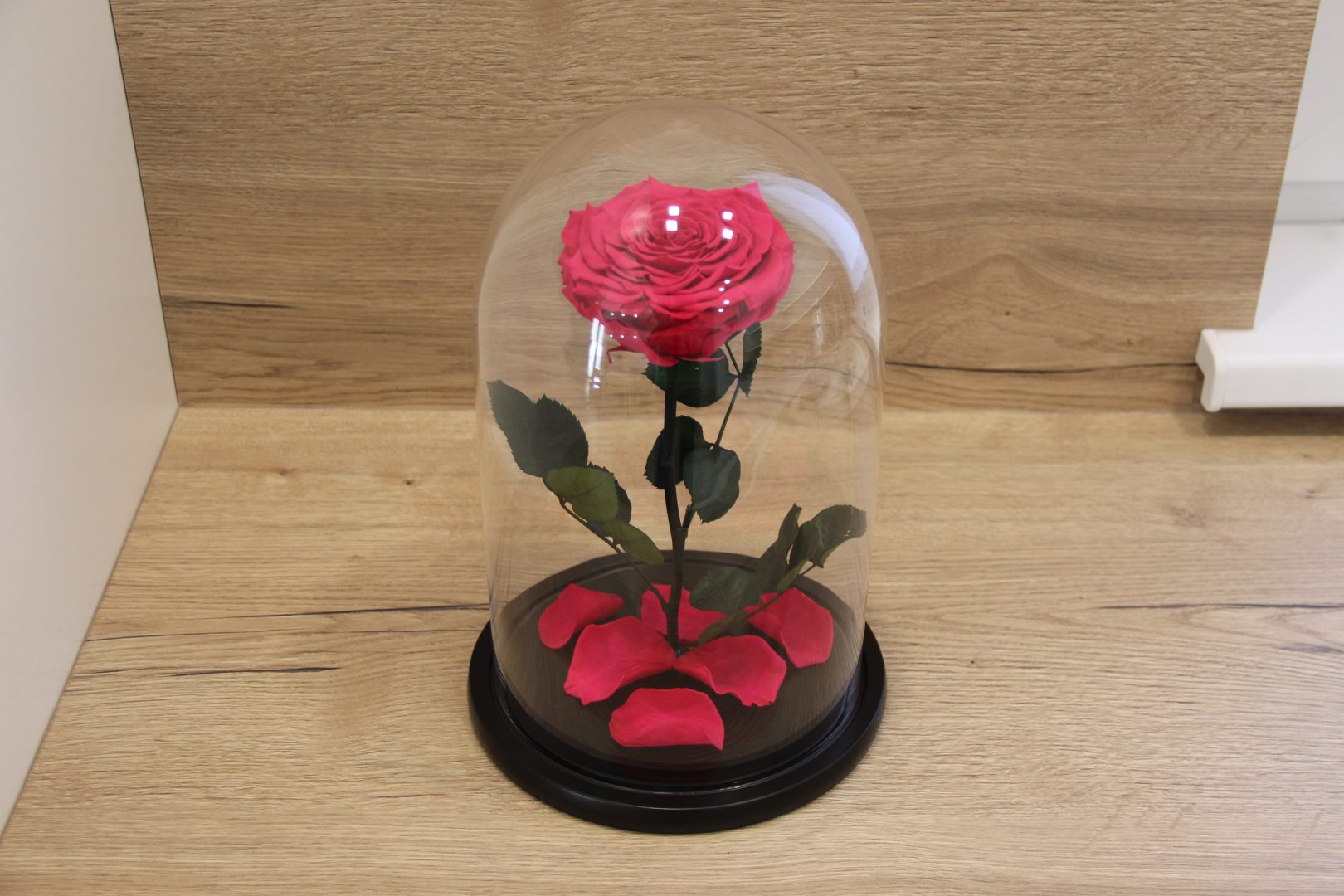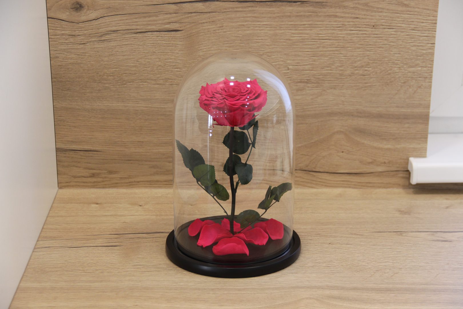 Tamsiai rausva mieganti rožė po kupolu iš filmo Gražuolė ir pabaisa.