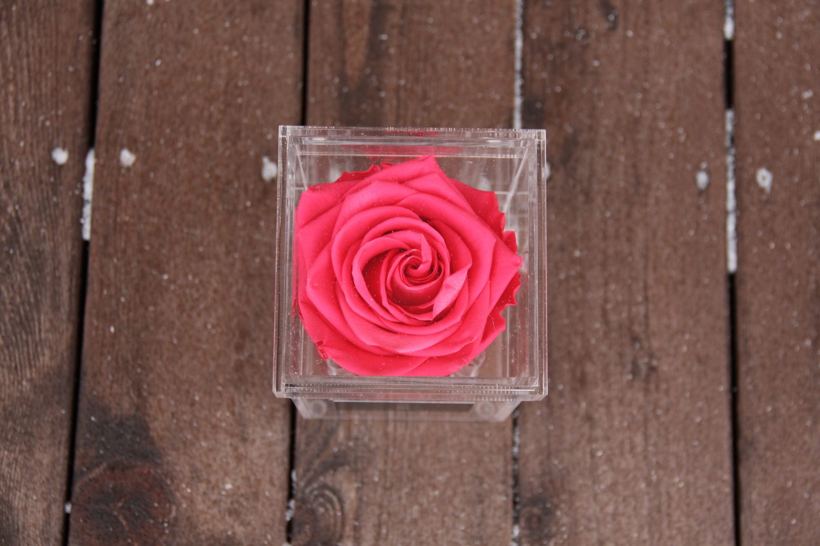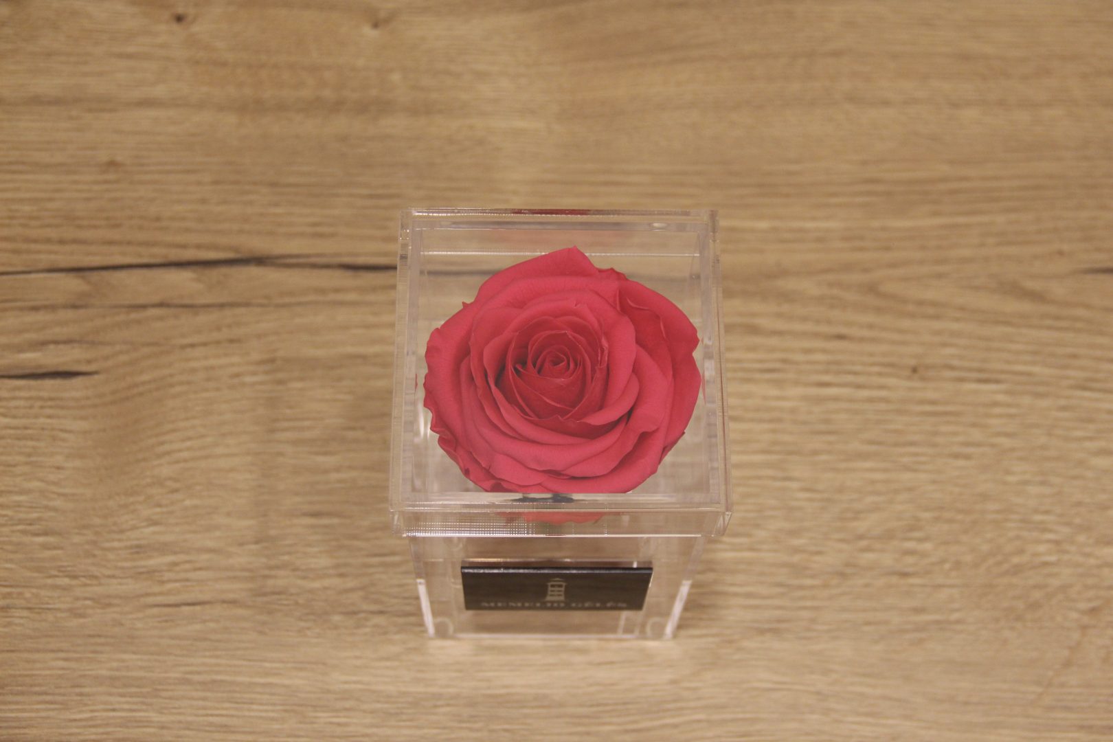 Akrilinė dėžutė su tamsiai rausva miegančia rože, kuri Jus džiugins iki kelerių metų.