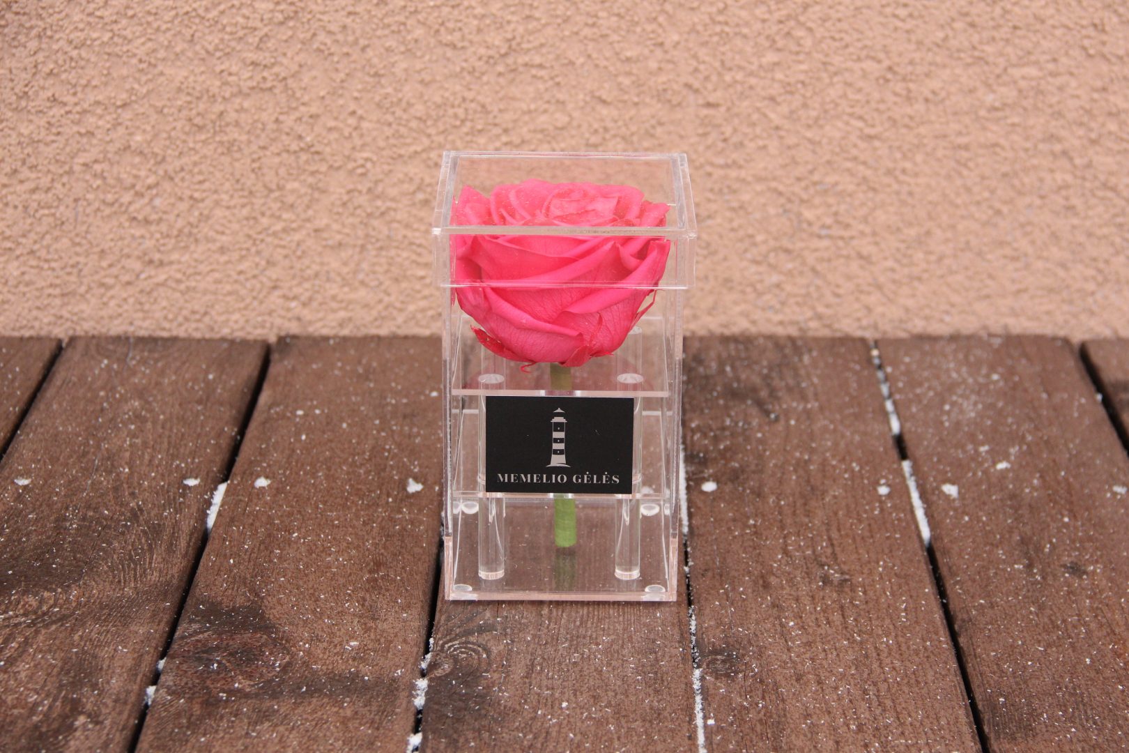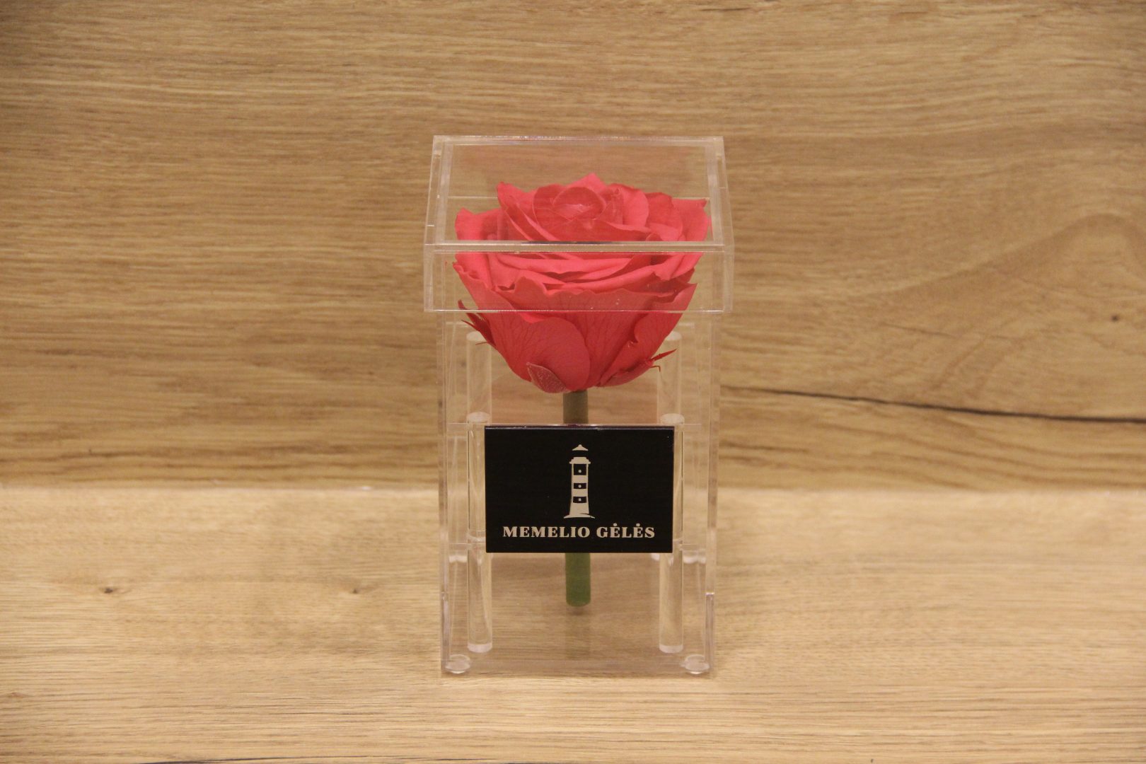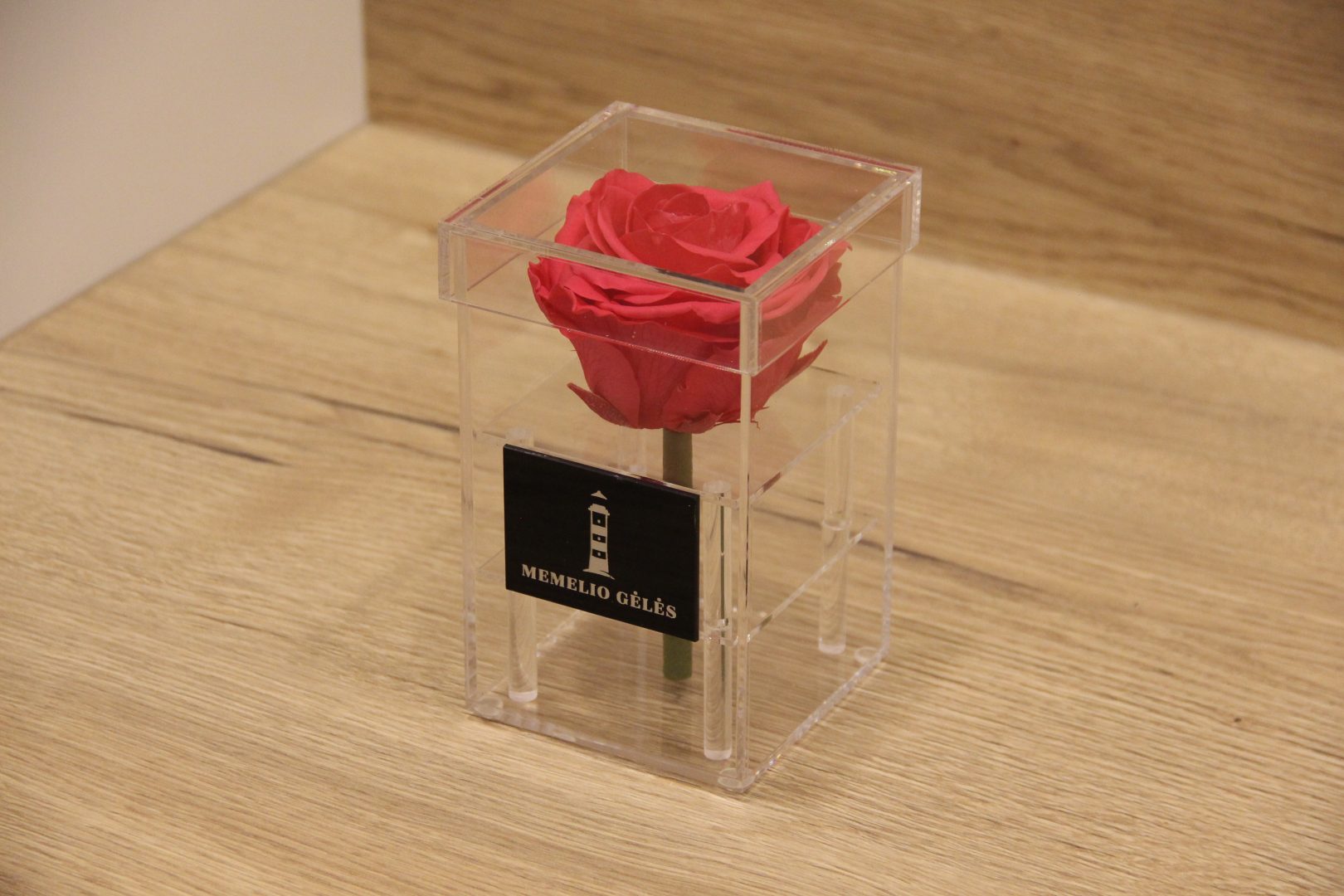 Akrilinės dėžutės išmatavimai – 9x9x15,5 cm, rožės žiedo skersmuo – apie 8 cm.