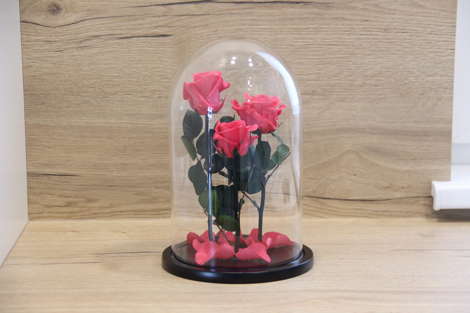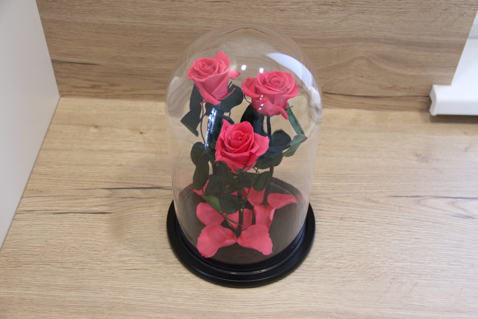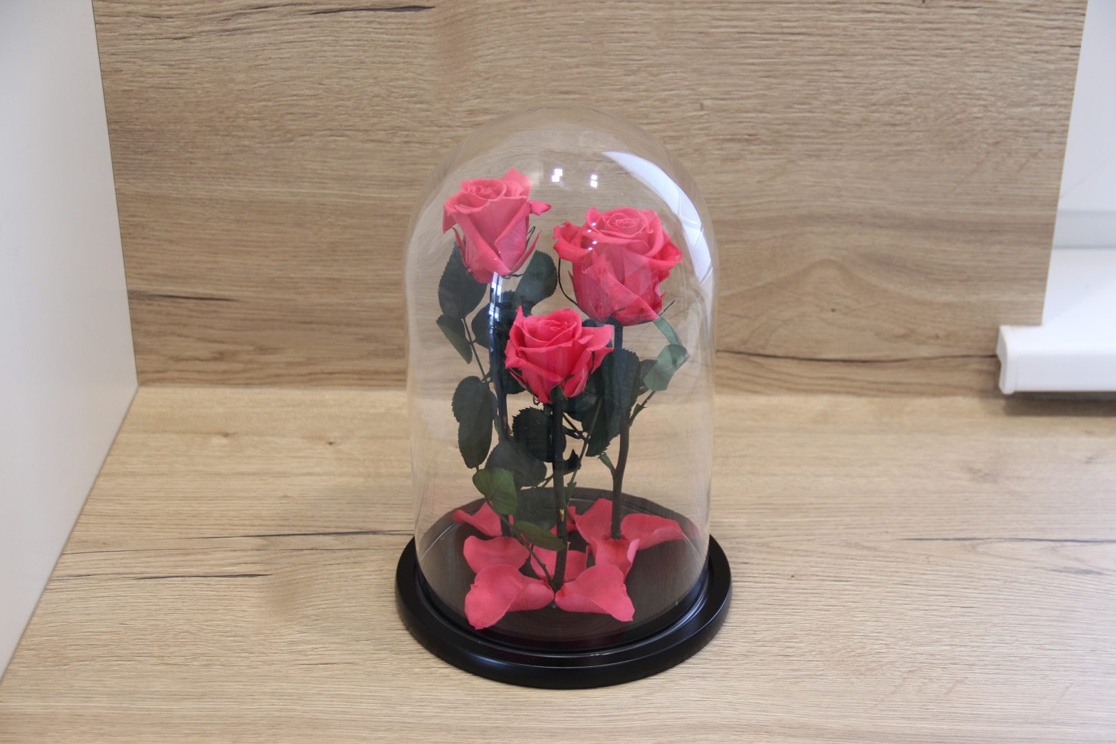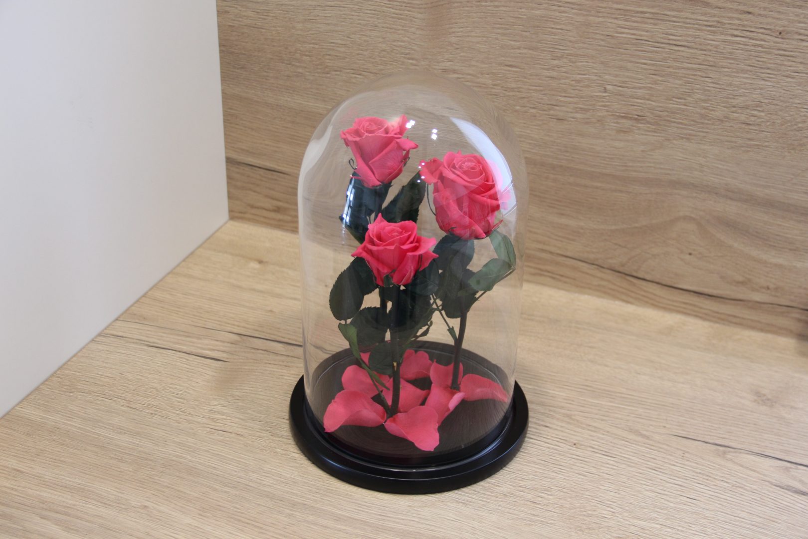 Tamsiai rausvos miegančios rožės po kupolu iš filmo Gražuolė ir pabaisa.