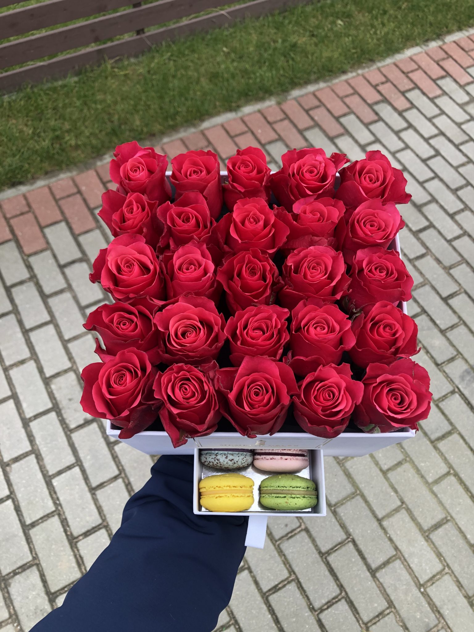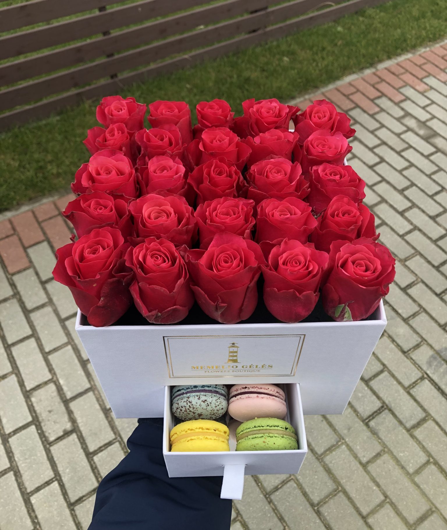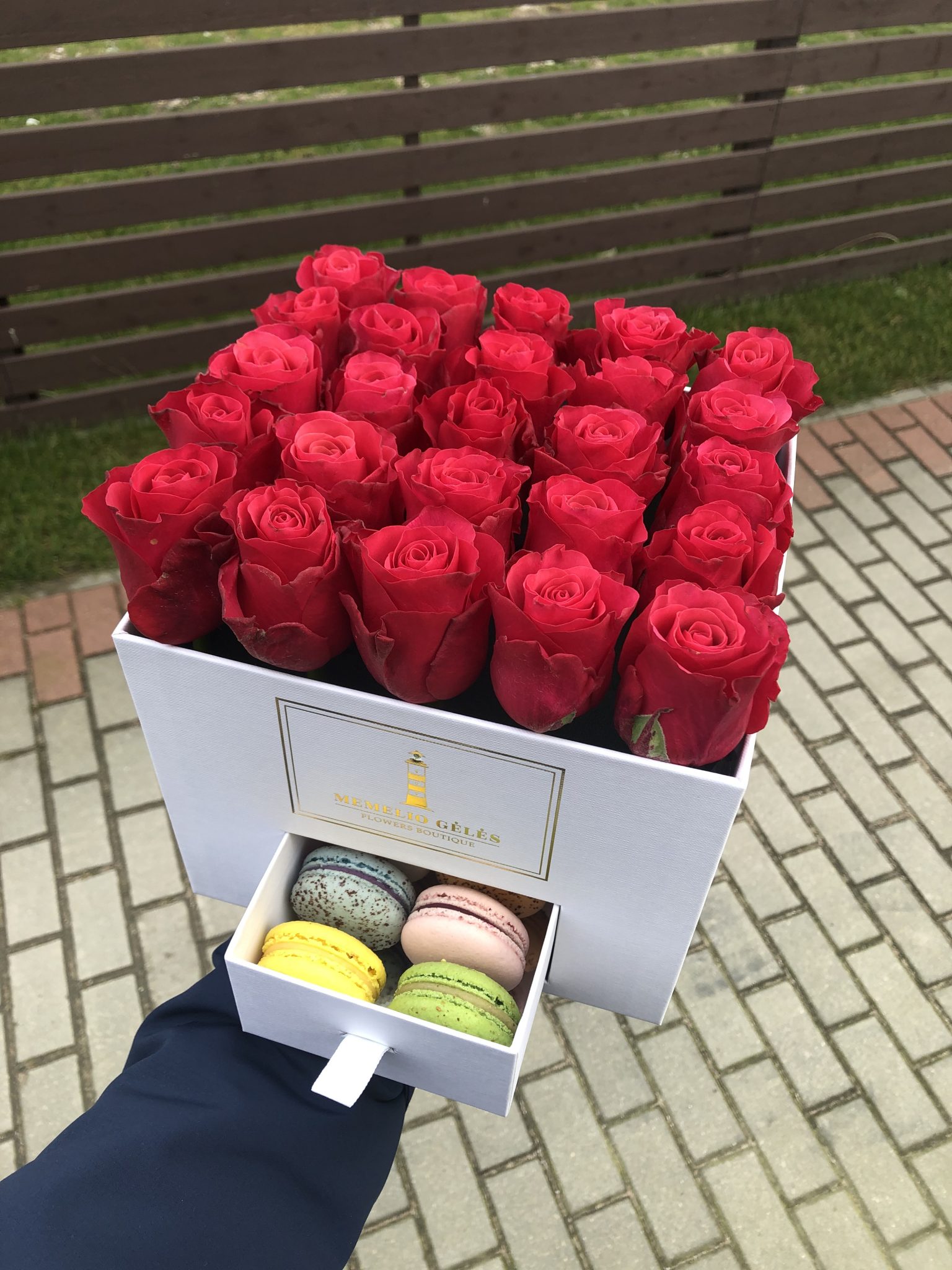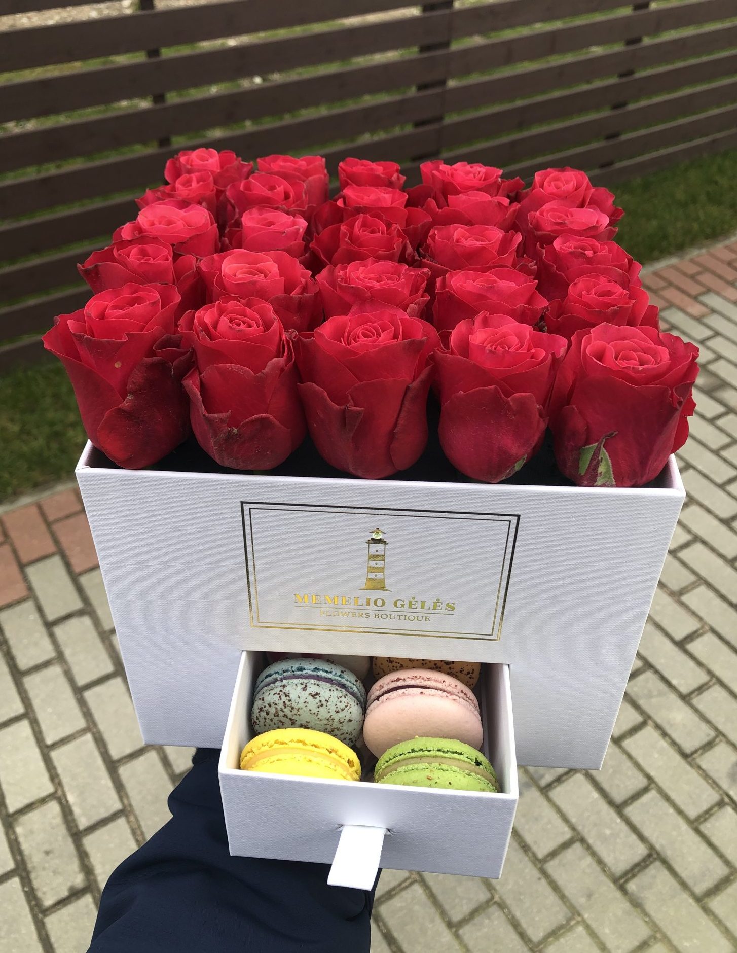 Tamsiai rausvų Tacazzi rožių dėžutė, kurioje sutalpiname 25 rožes, o stalčiuke – 6 Macarons sausainukai.