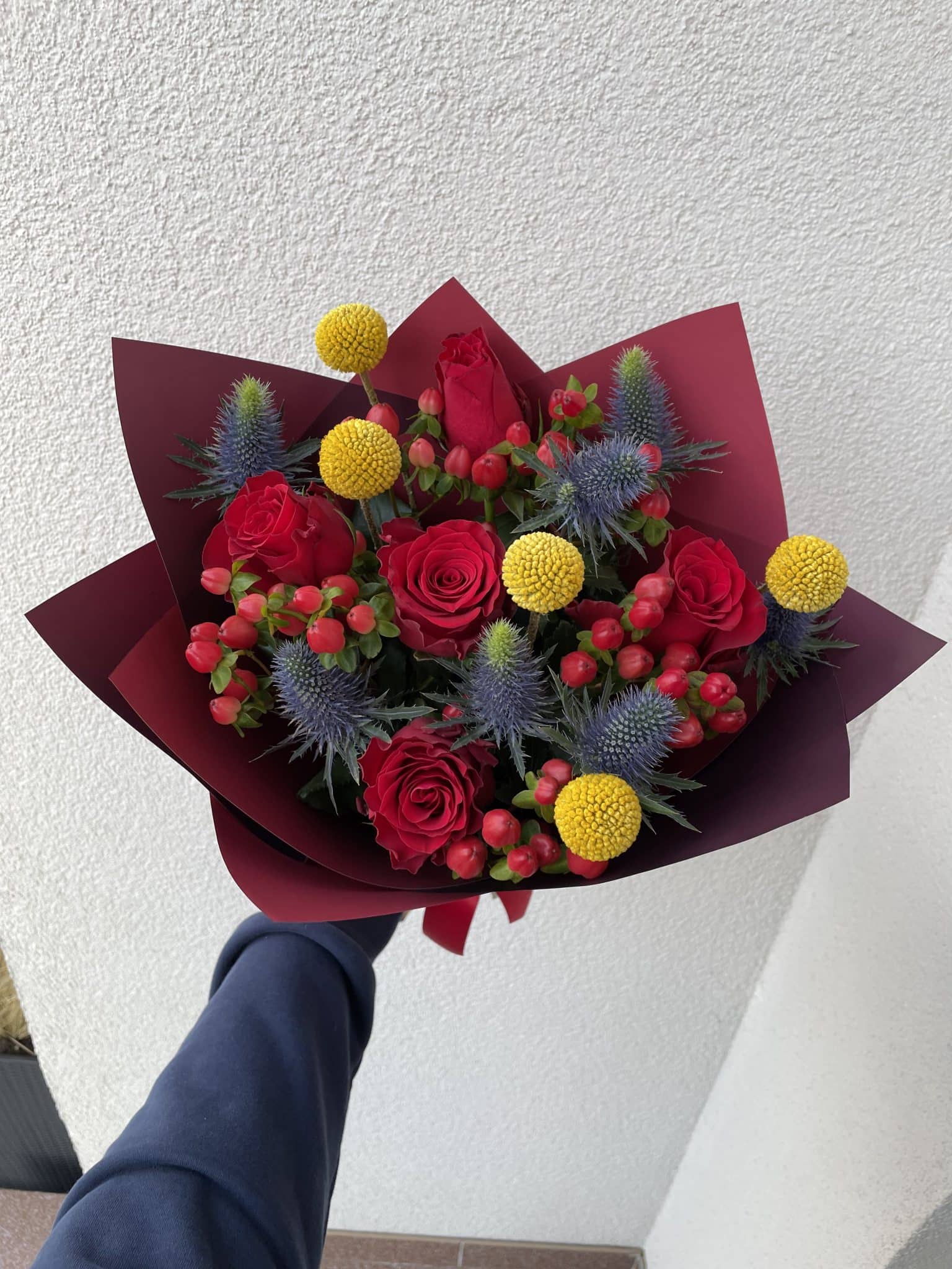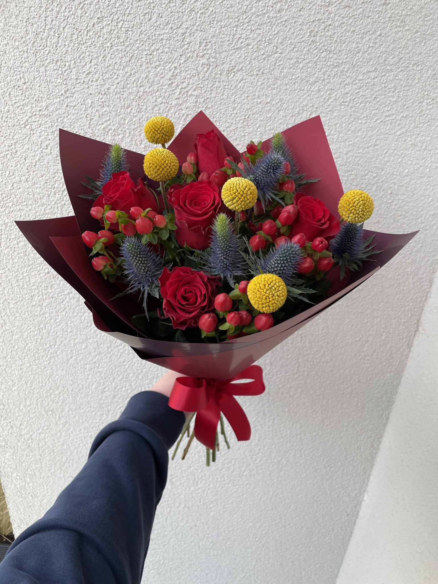 Įvairių gėlių puokštė iš 17 žiedų: Rhodos rožės, raudoni hiperikumai, mėlyni ežiukai ir geltonos kraspedijos.