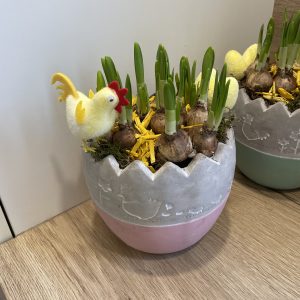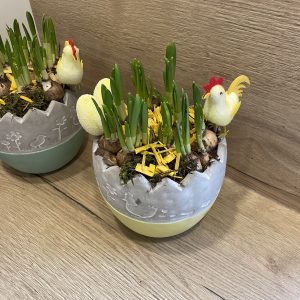 Velykinė kompozicija vazone su narcizais ir dekoracijomis.