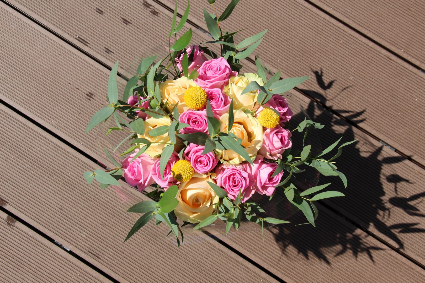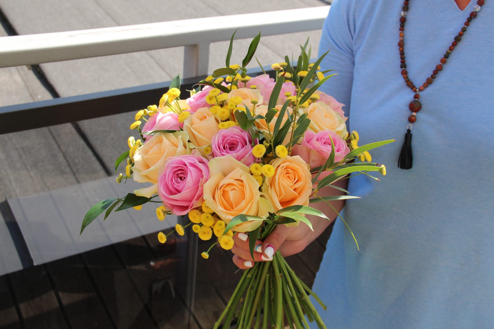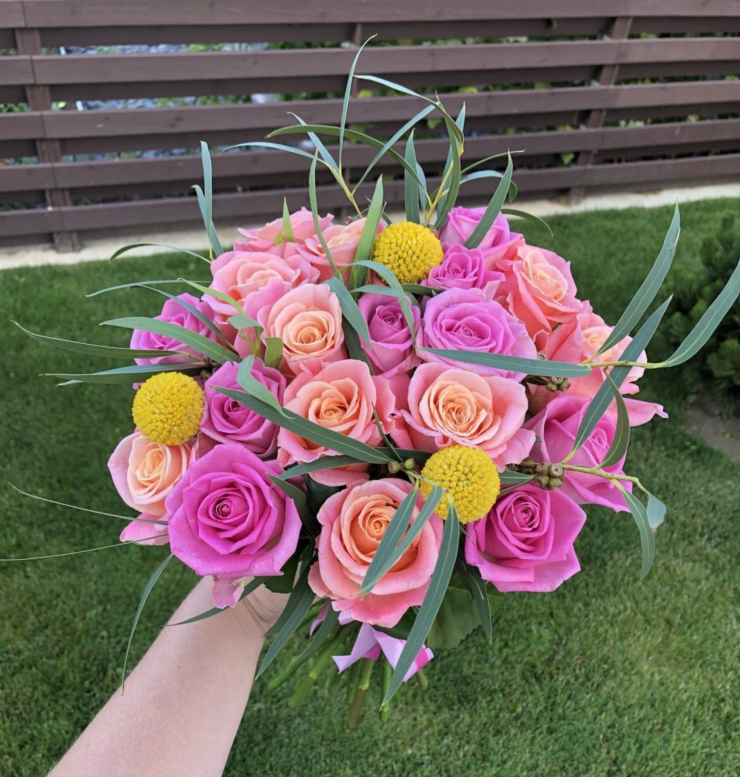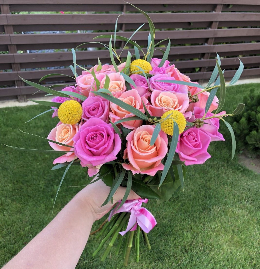 Puokštė su persikinėmis ir rausvomis rožėmis. Kompoziciją sudaro apie 19 rožių ir žaluma.