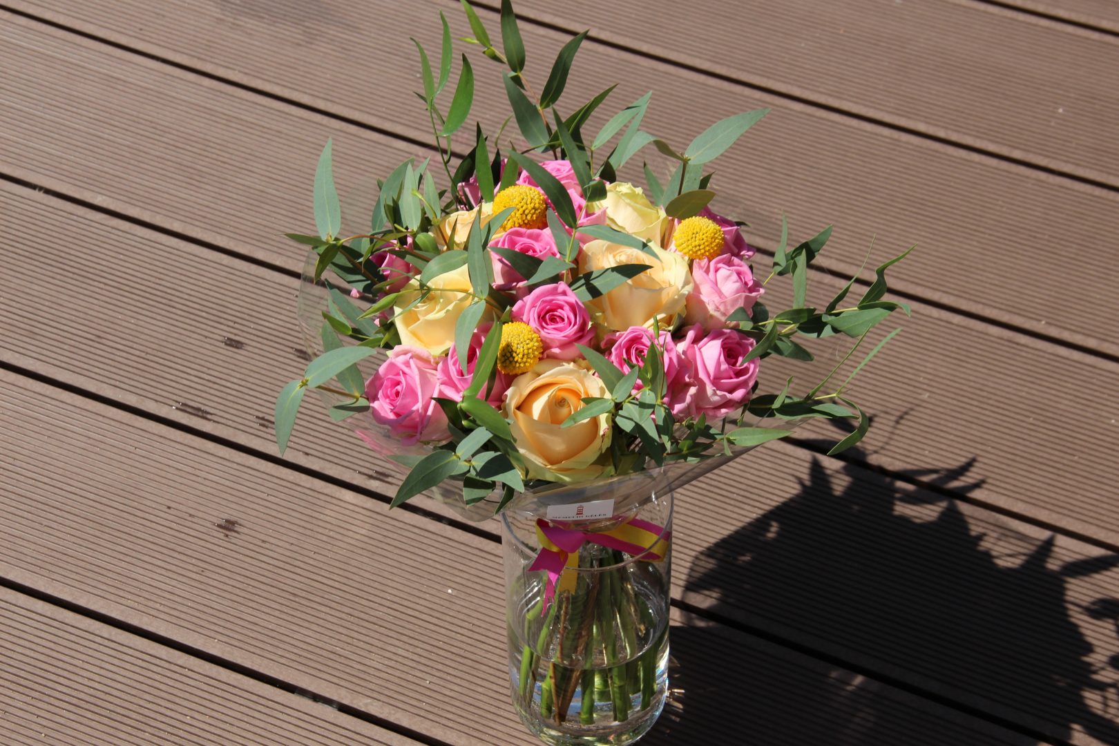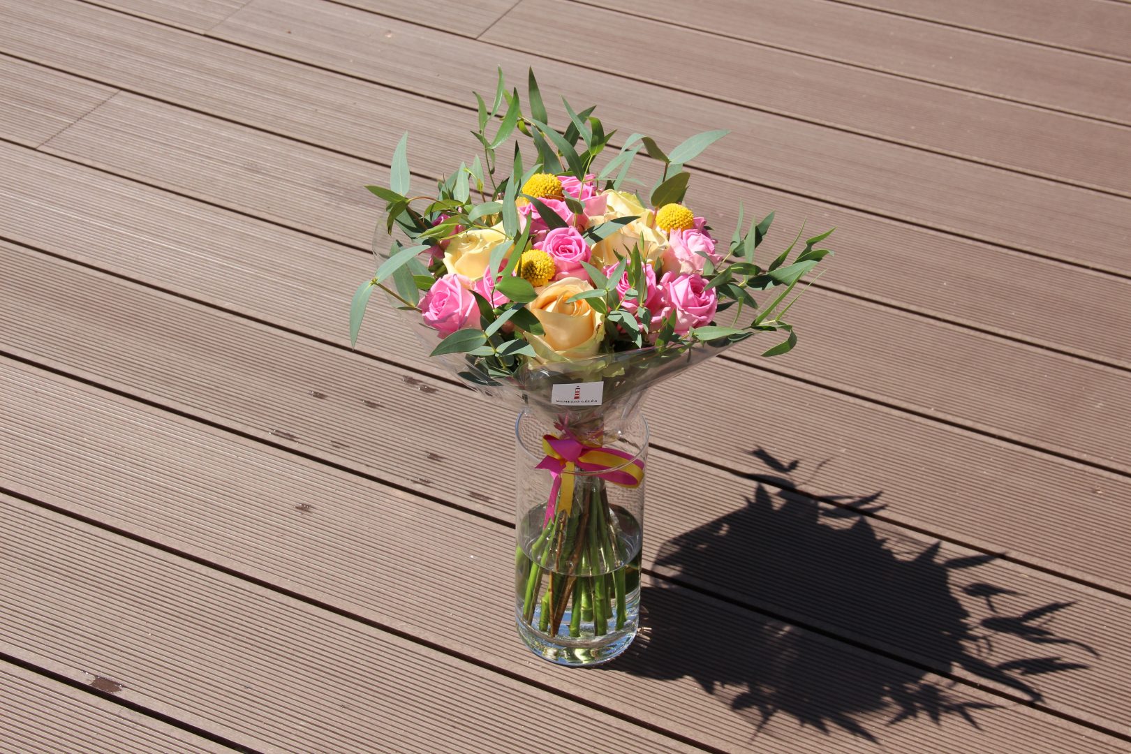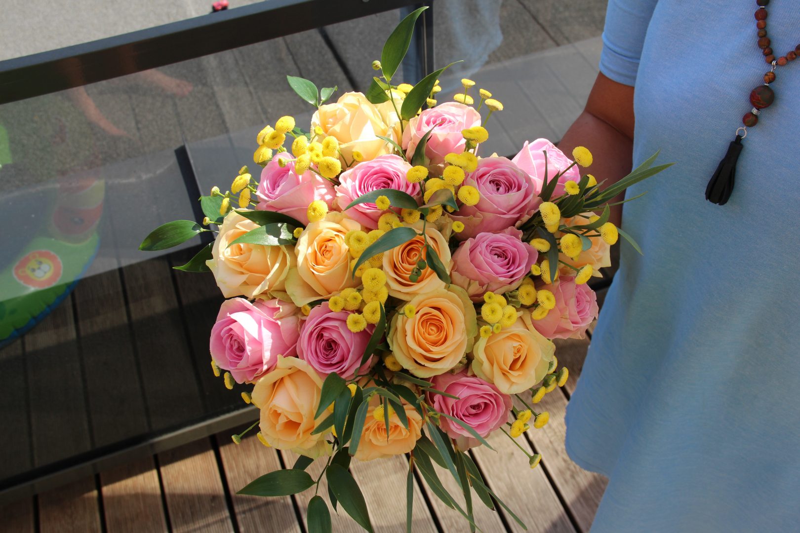 Puokštė su persikinėmis ir rausvomis rožėmis. Kompoziciją sudaro apie 19 rožių ir žaluma.