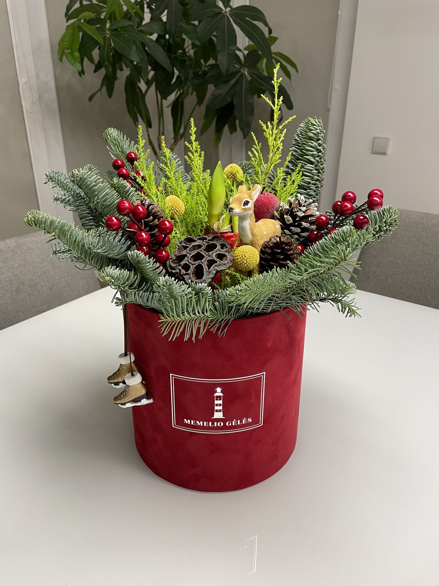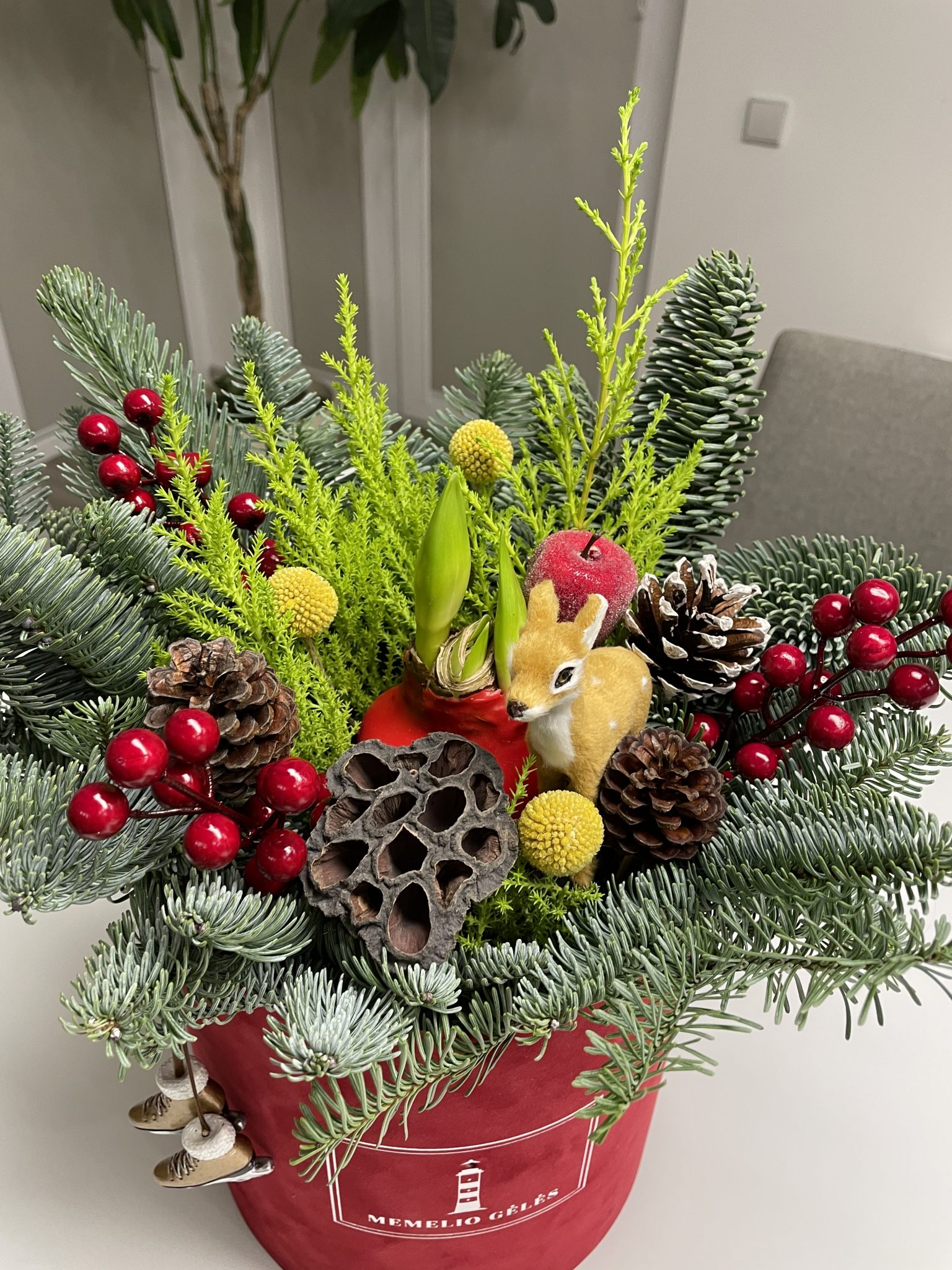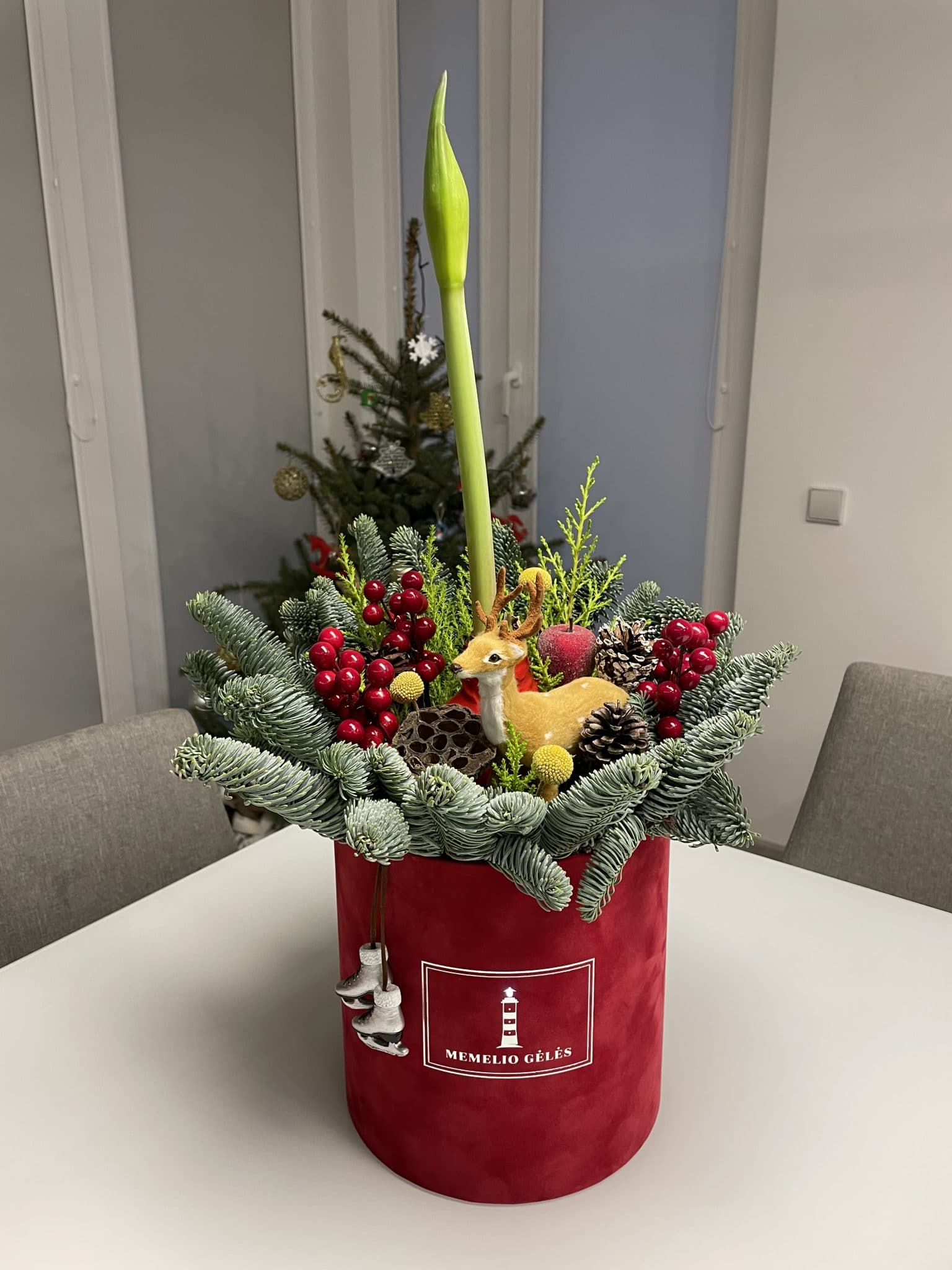 Raudonoje barchatinėje dėžutėje – kėnio šakos, žaluma, kraspedijos, įvairūs šventiniai papuošimai bei amarilis, kuris sužydės daugmaž Kalėdiniu laikotarpiu ar kiek vėliau.