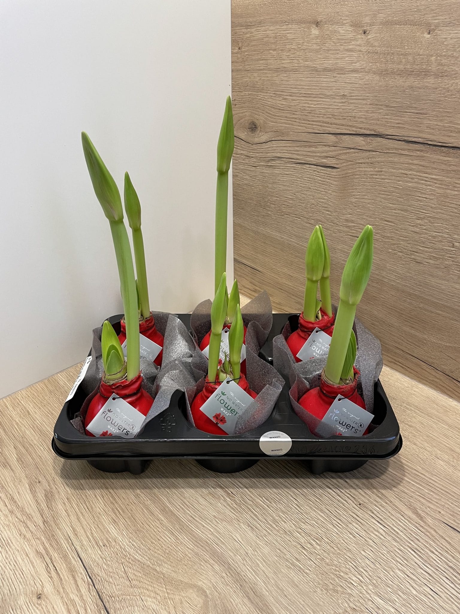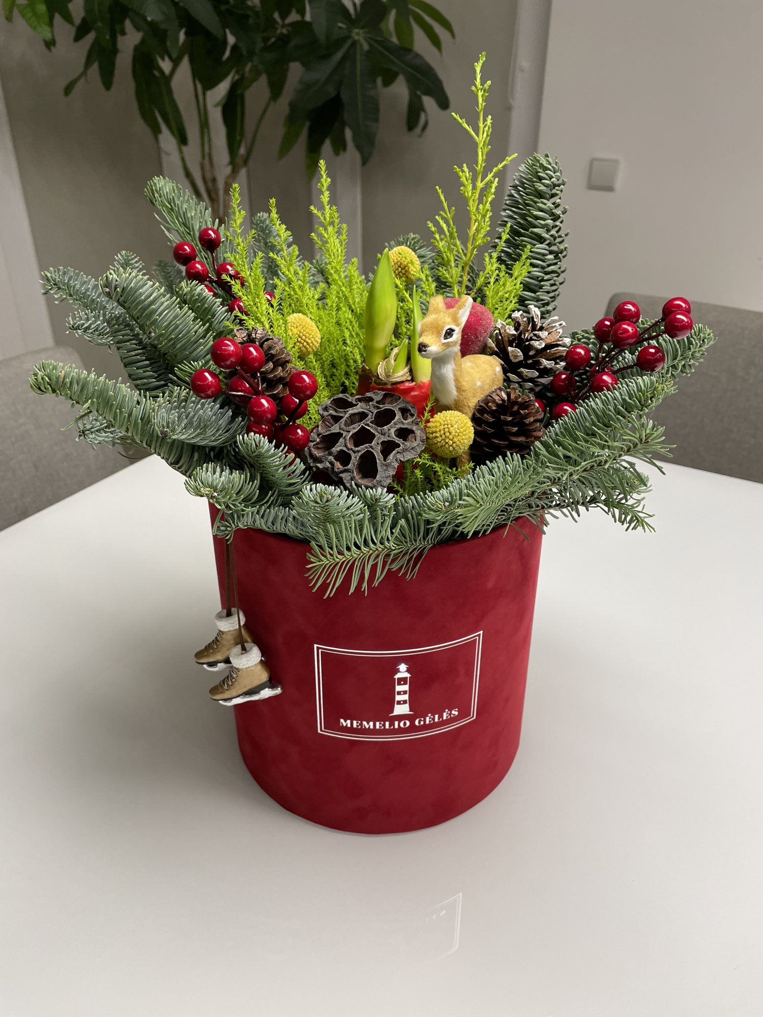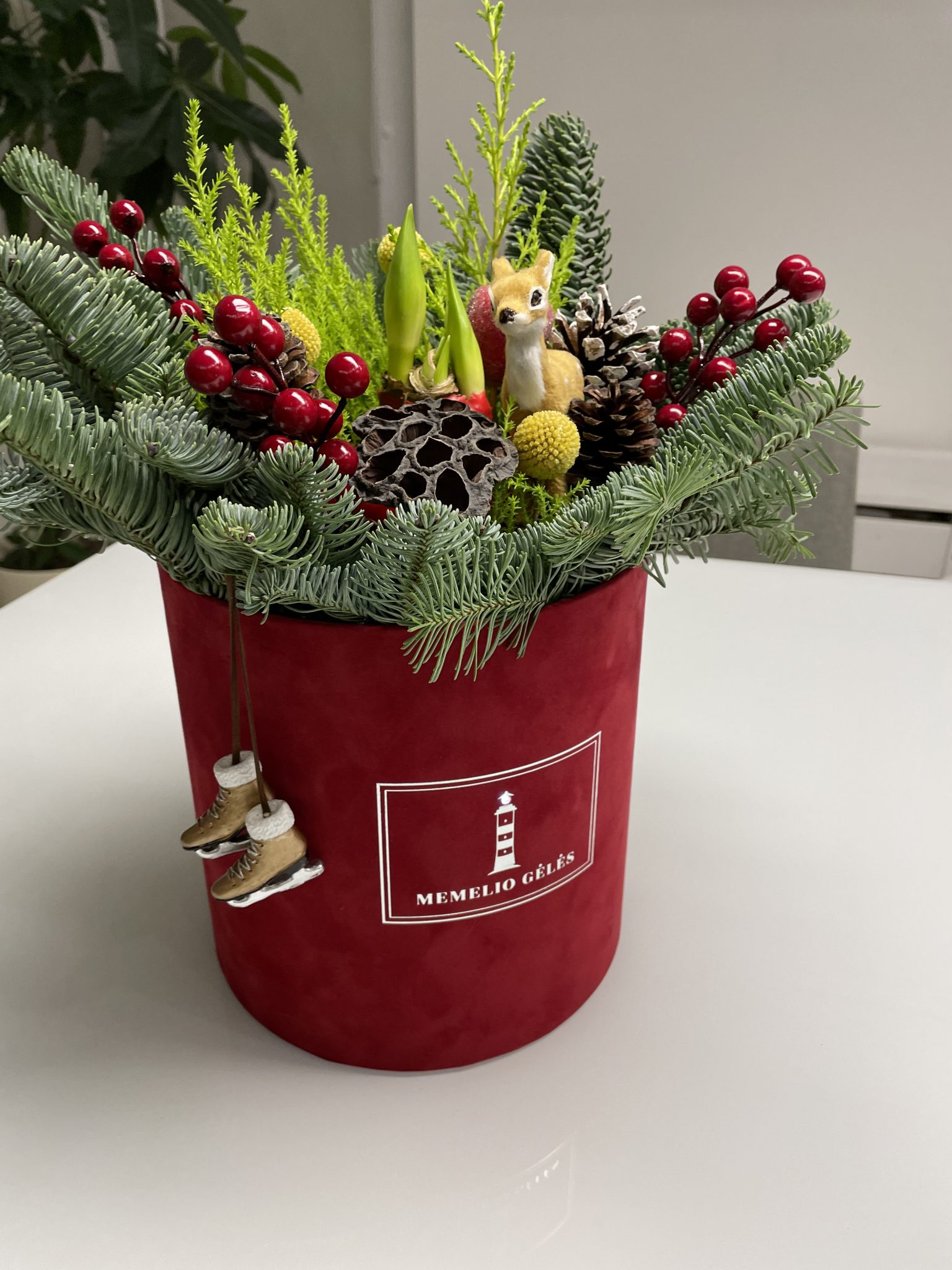 Raudonoje barchatinėje dėžutėje – kėnio šakos, žaluma, kraspedijos, įvairūs šventiniai papuošimai bei amarilis, kuris sužydės daugmaž Kalėdiniu laikotarpiu ar kiek vėliau.