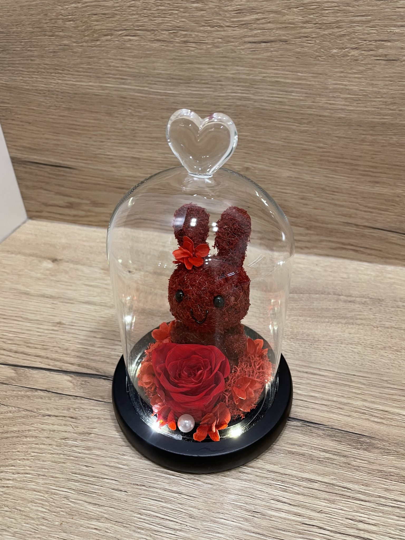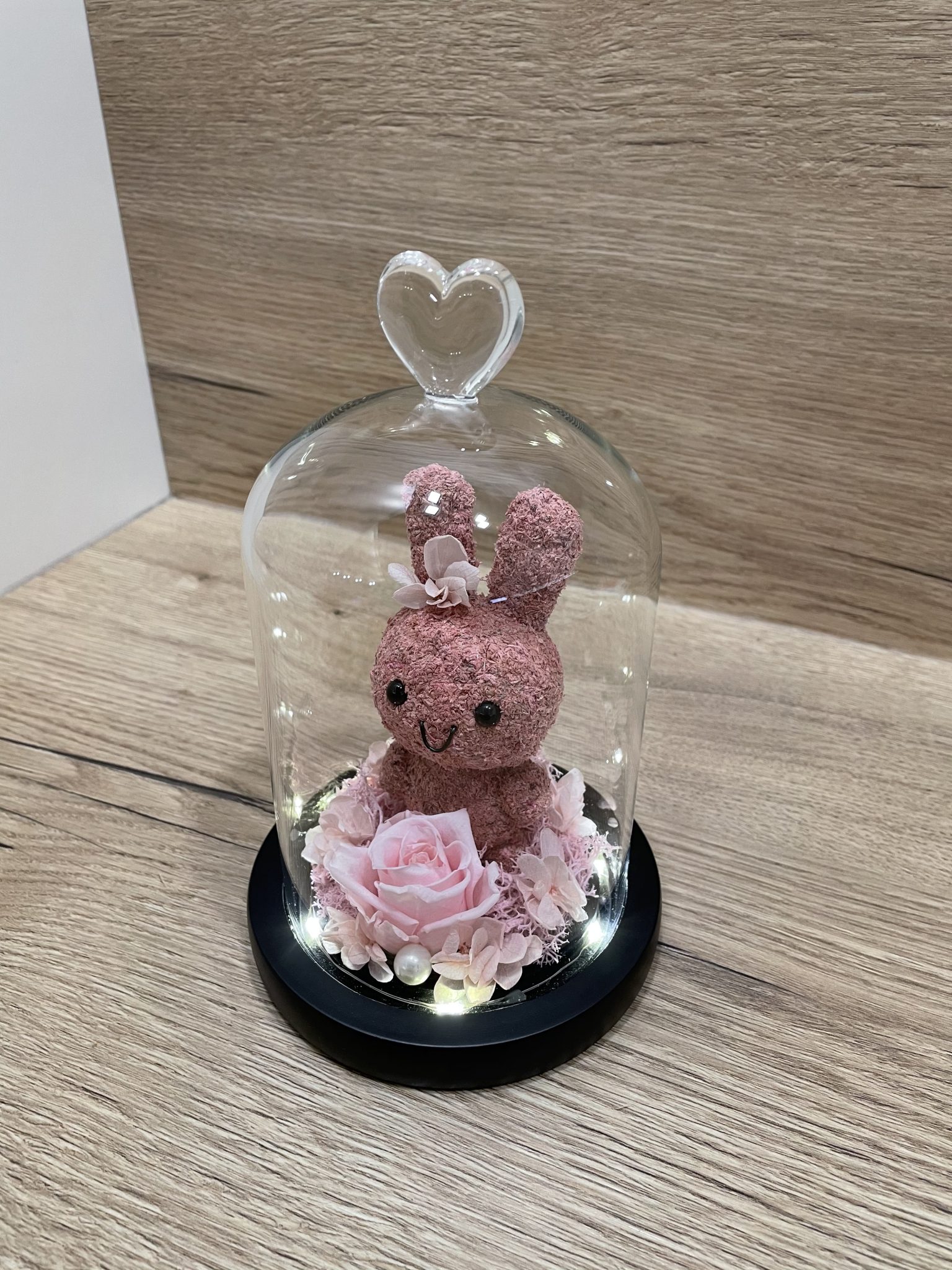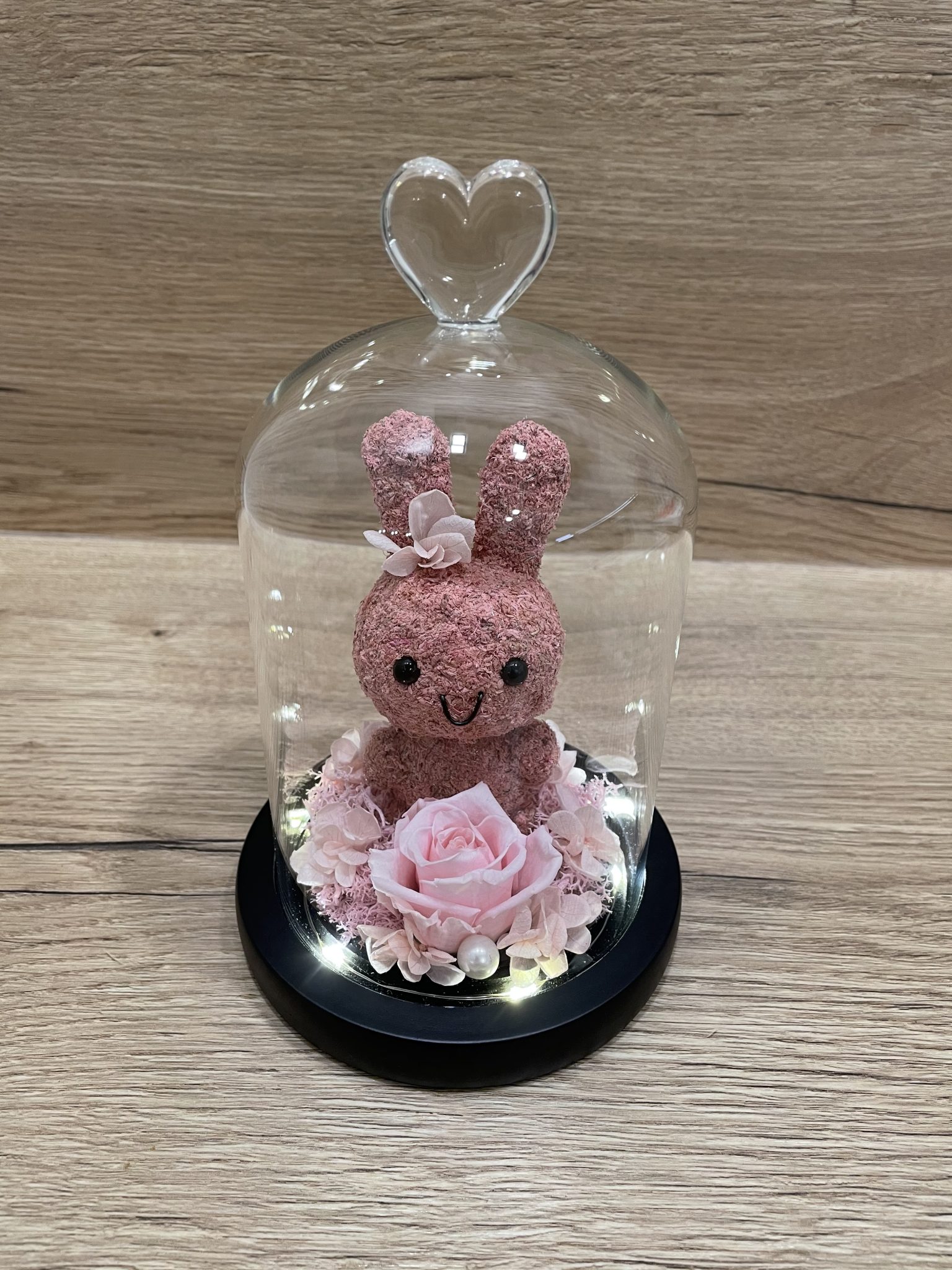 Zuikutis iš samanų su miegančia rože po kupolu ir led lemputėmis.