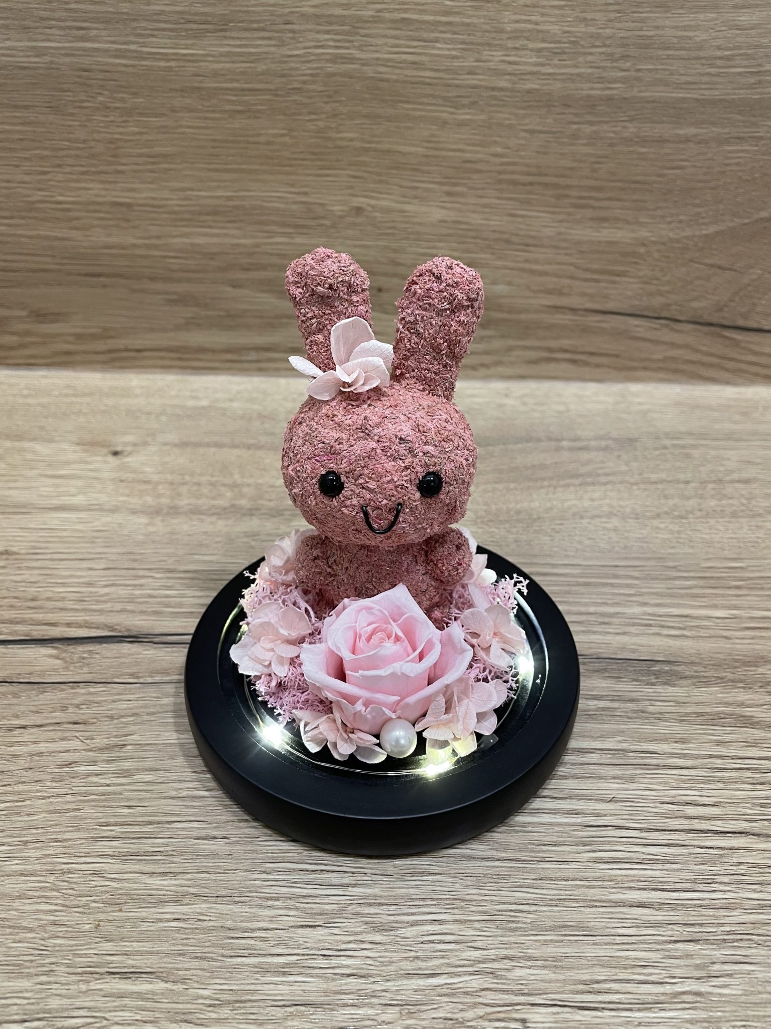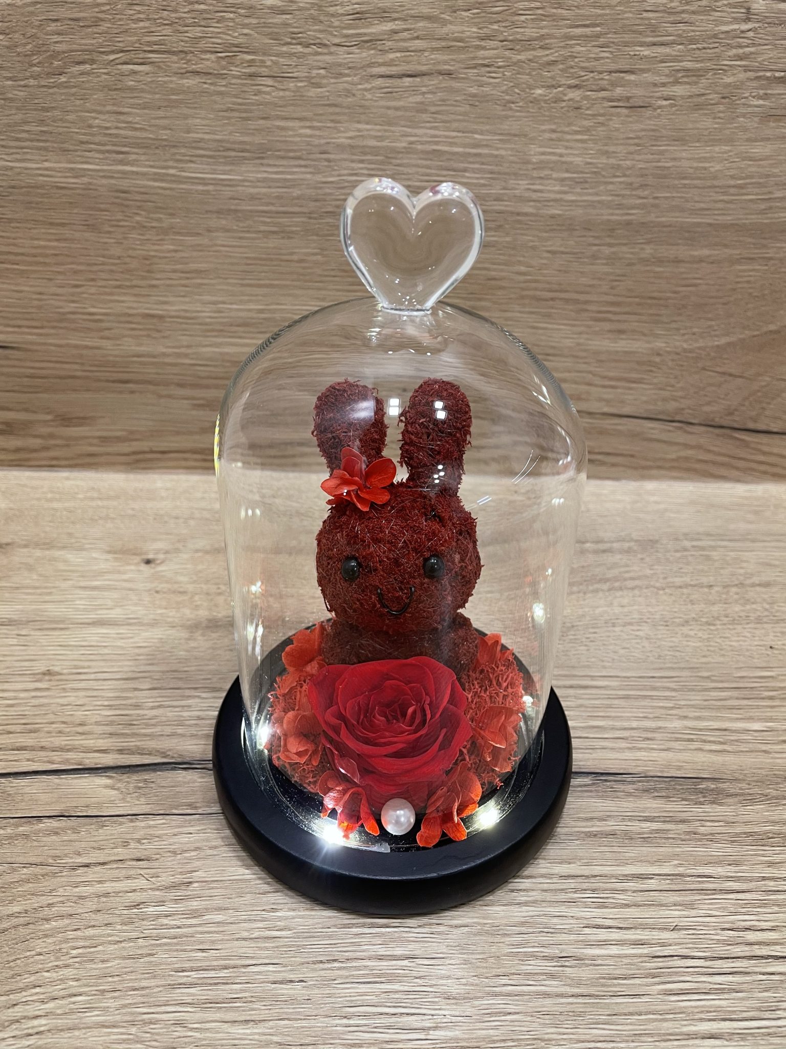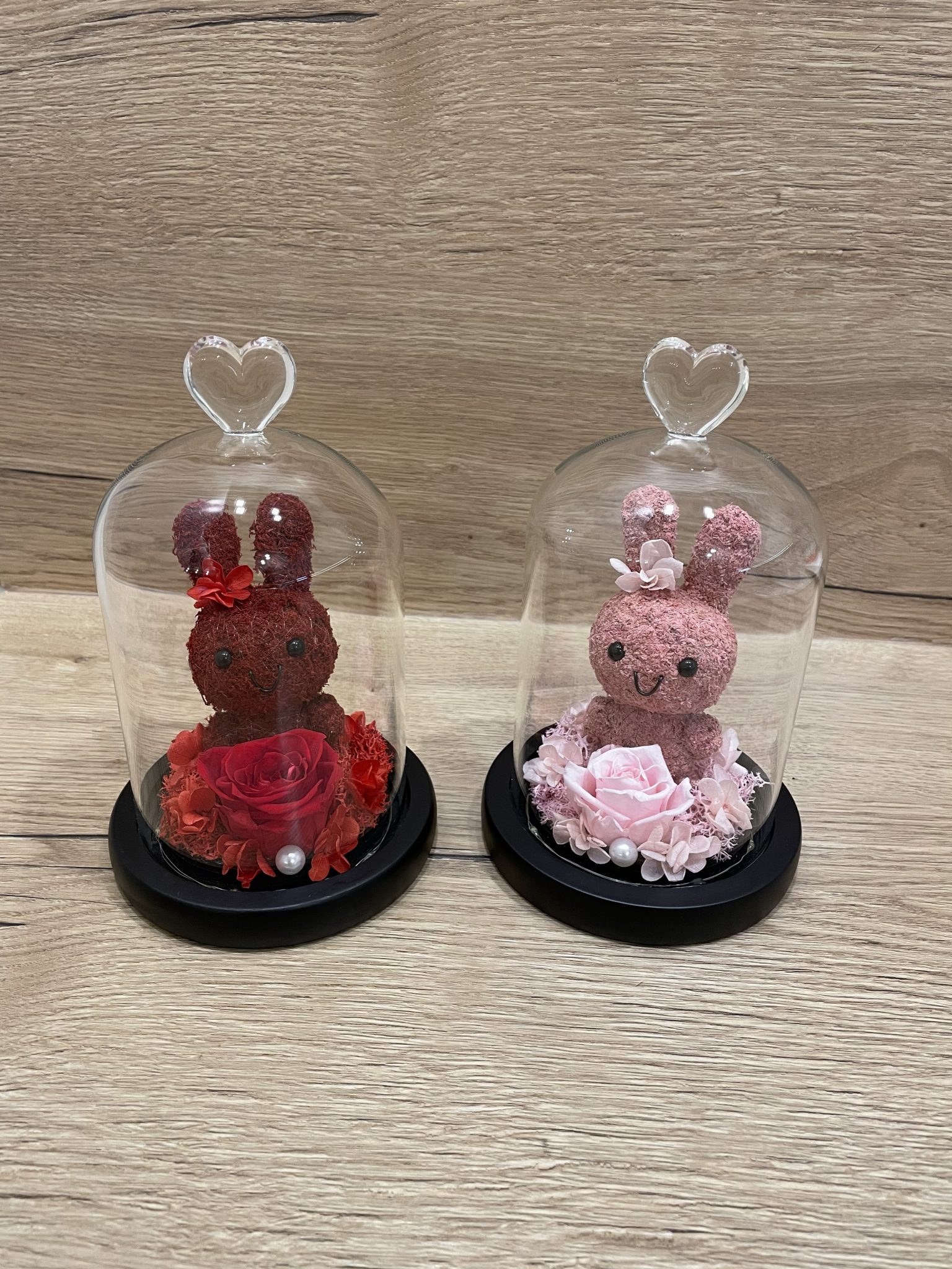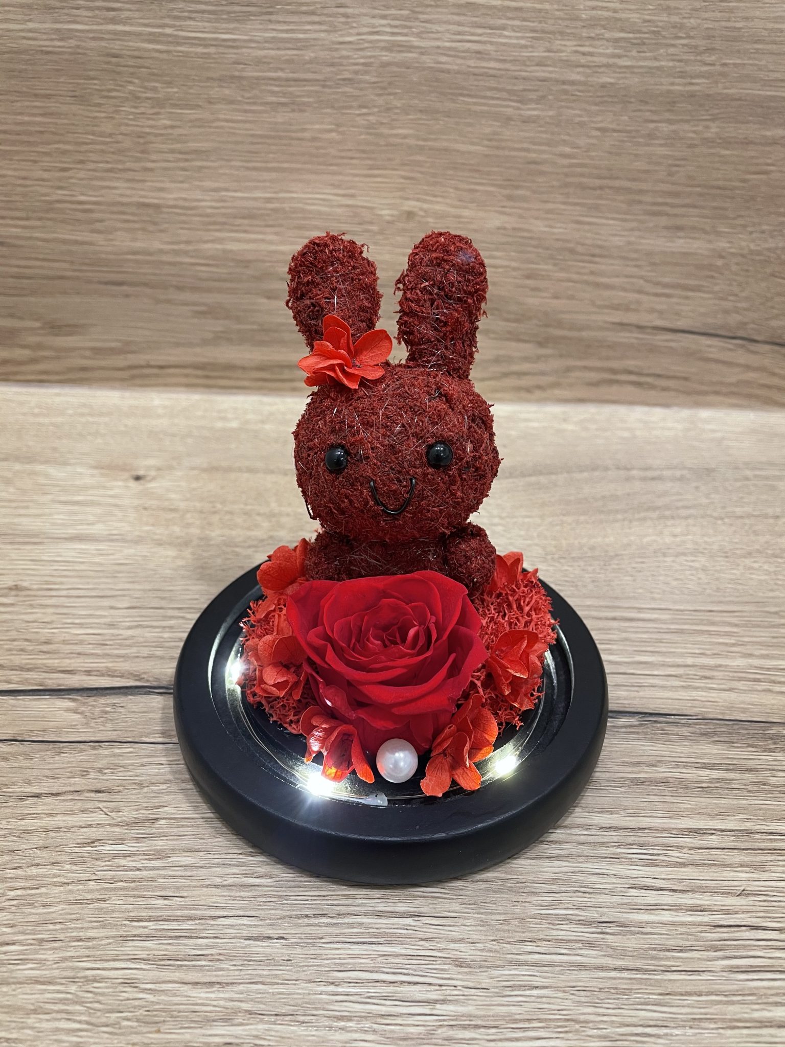 Zuikutis iš samanų su miegančia rože po kupolu ir led lemputėmis.