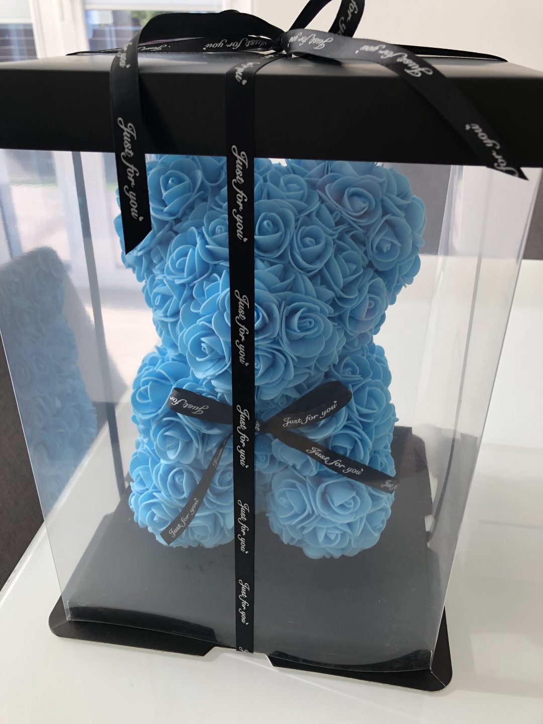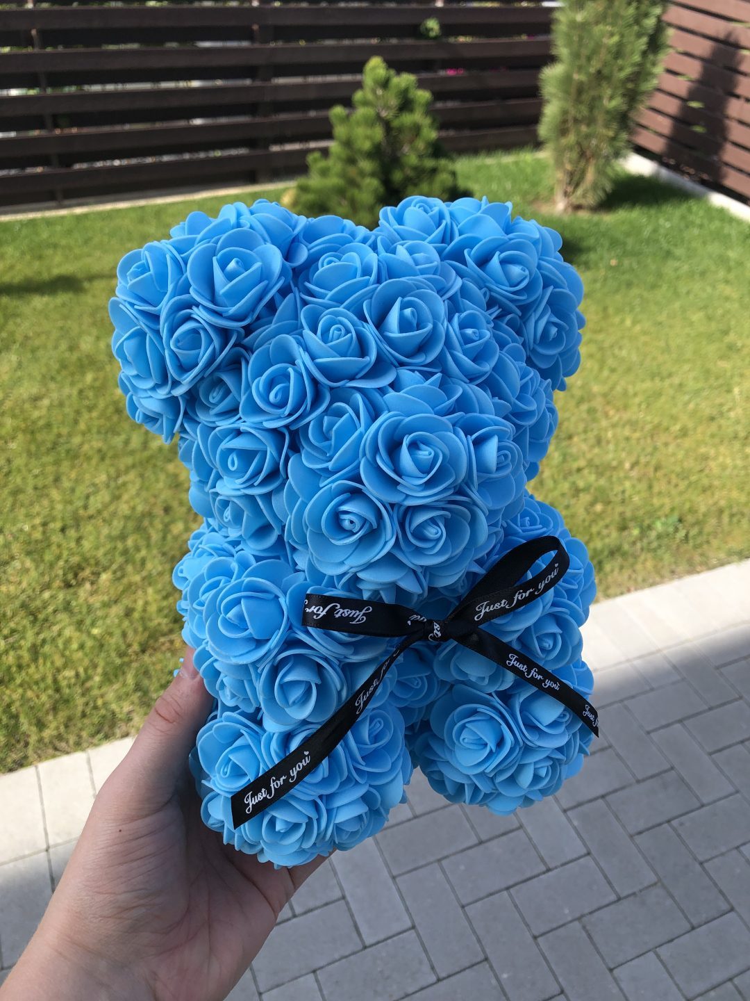 Meškiukas pagamintas iš daugiau nei 200 mažų dirbtinių rožyčių.